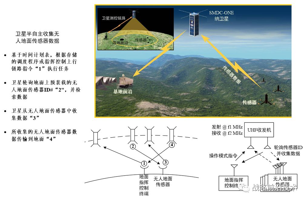 陆军认为在许多远程作战区域,从战场到如旅级司令部的超视距通信几乎无法得到支持。为此,启动了一项研制通信纳卫星的计划即“太空与导弹防御司令部:纳卫星作战效果”(SMDC-ONE)。SMDC-ONE纳卫星计划的总目的如下:大量部署的纳卫星能够提供高纬度地区甚至全球的增强能力。由于成本低,可经常更新卫星,从而允许快速技术更新,降低单元可靠性要求,能进行大规模生产。纳卫星星座对于战术地面行动、人道主义援助、维稳行动非常有用。可以提供特定区域覆盖或全球覆盖。卫星能与地面站通信,并保持在轨30天。陆军订购8颗SMDC-ONE纳卫星,目前有4颗在轨,即SMDC-ONE-1.1、SMDC-ONE-1.2、SMDC-ONE-2.3、SMDC-ONE-2.4。其中,首颗SMDC-ONE卫星的主要应用有两个,即收集无人地面传感器(部署在远程,用于跟踪敌军机动情况)数据(图1)和动中通信(图2)。