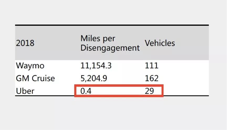 我们看一下2018年的数据,左面这一列,是每开了多少英里有一次人工的干预,像谷歌是1.1万英里,很厉害; Uber是每开0.4英里要有一次干预,而其在加州一共测试的车辆是29辆,跟刚才说的2019年要实现7.5万辆是一个巨大的差距。