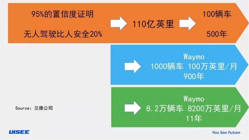 兰德公司给出了一个数据叫110亿英里,这需要你要有100辆车不吃不喝不睡开500年。Waymo现在有接近1000辆车,一个月开100万英里,要开900年才能开得到。Waymo说要买8.2万辆车,每个月跑8200万英里,也要开11年。