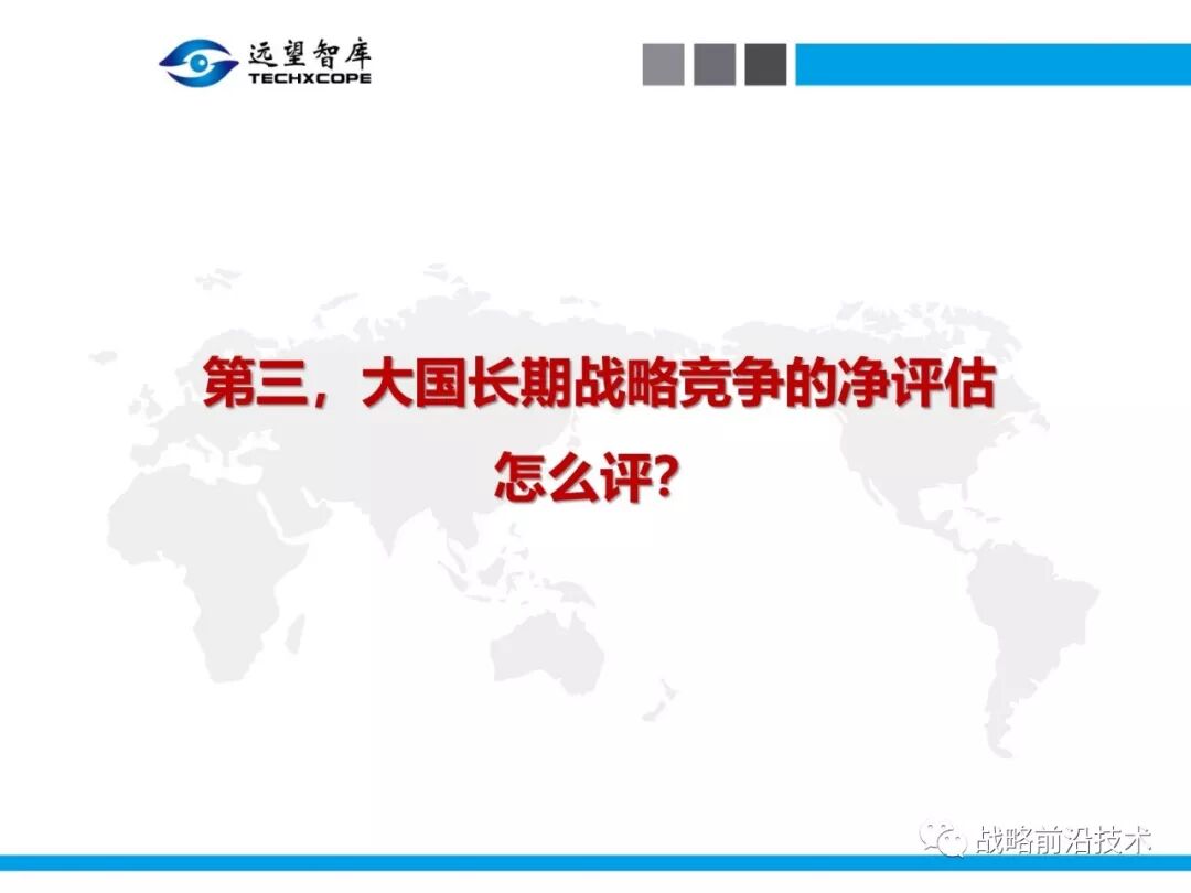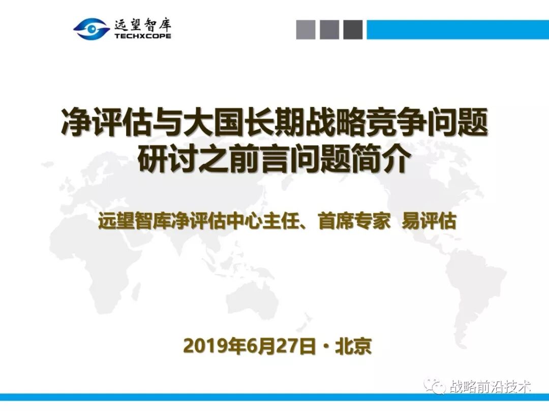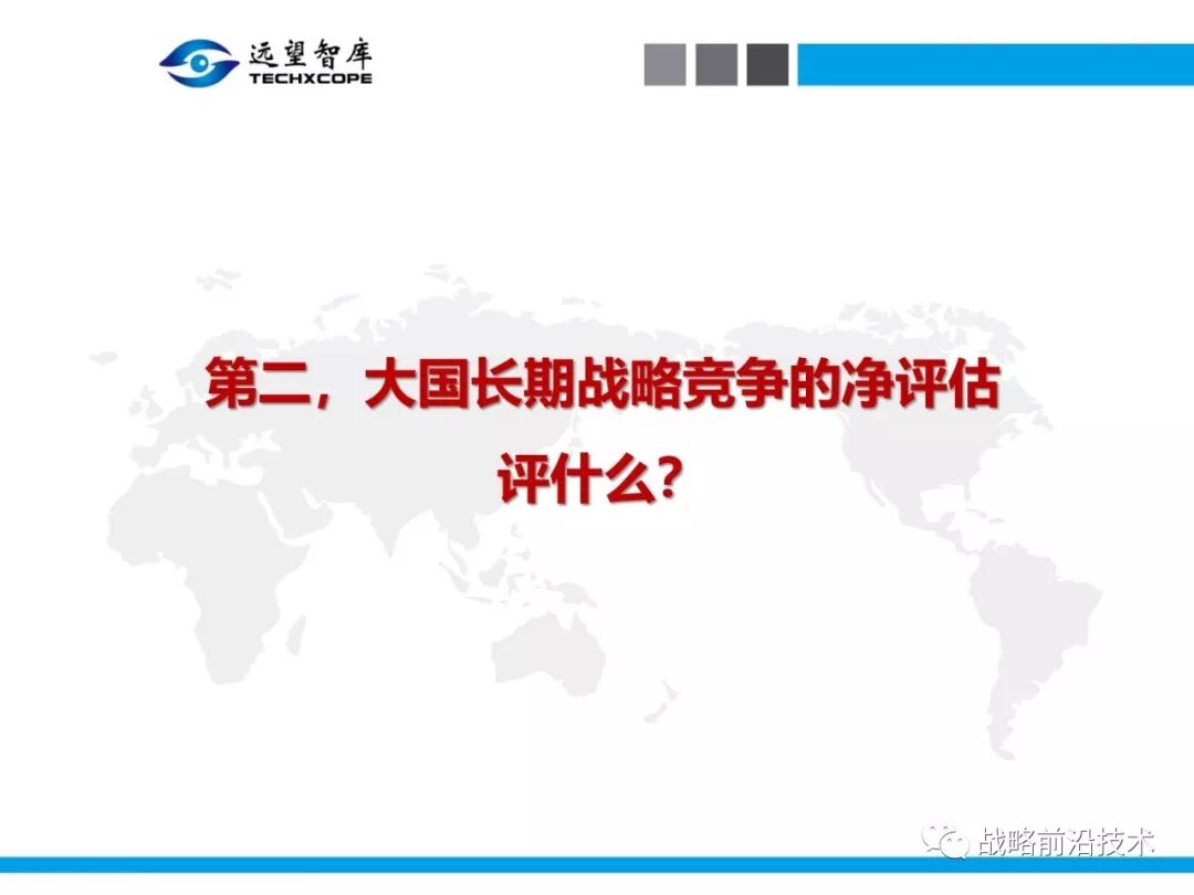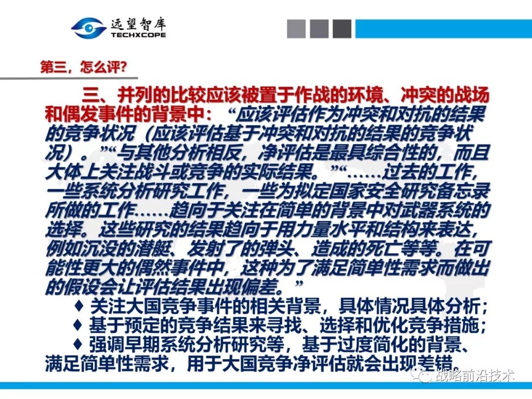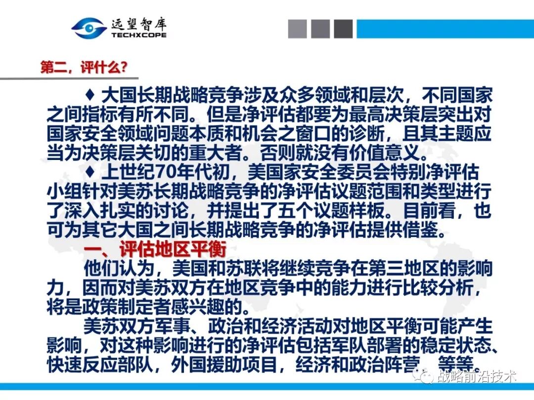 为帮助相关人员了解、熟悉、掌握和借鉴运用净评估思维理念及方法手段,深入研究探讨净评估与大国长期战略竞争的相关问题,远望智库于6月27日下午,以“净评估与大国长期战略竞争问题研讨”为主题,在北京中航广场举办了第七期“净评估十”学术沙龙。来自相关领域的专家围绕以下四个问题进行了研讨:一是为什么大国长期战略竞争要净评估?二是大国长期战略竞争的净评估评什么?三是大国长期战略竞争的净评估怎么评?四是大国长期战略竞争的净评估案例介绍,以及启示与思考问题。应相关人员要求,现将本期学术沙龙开始时的引导发言PPT部分稍加整理、增强可读性,并予以发布,仅供参考。