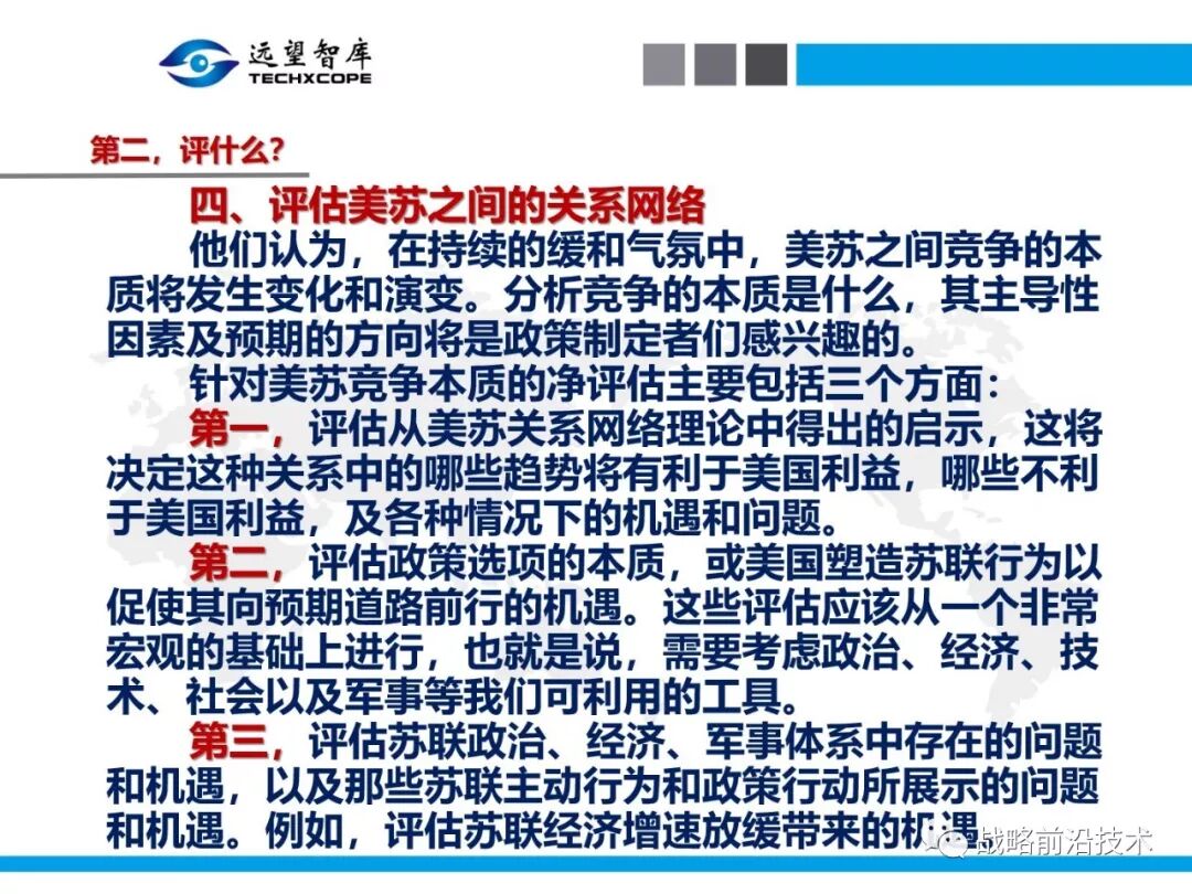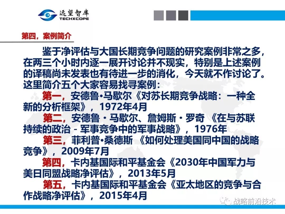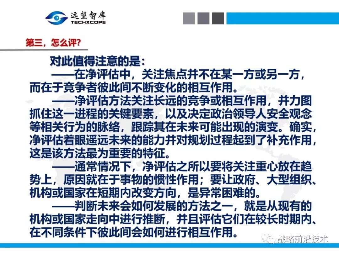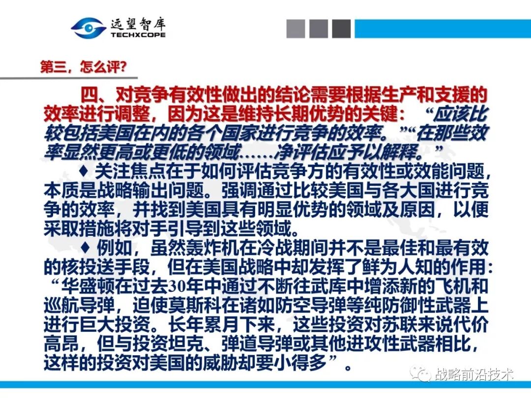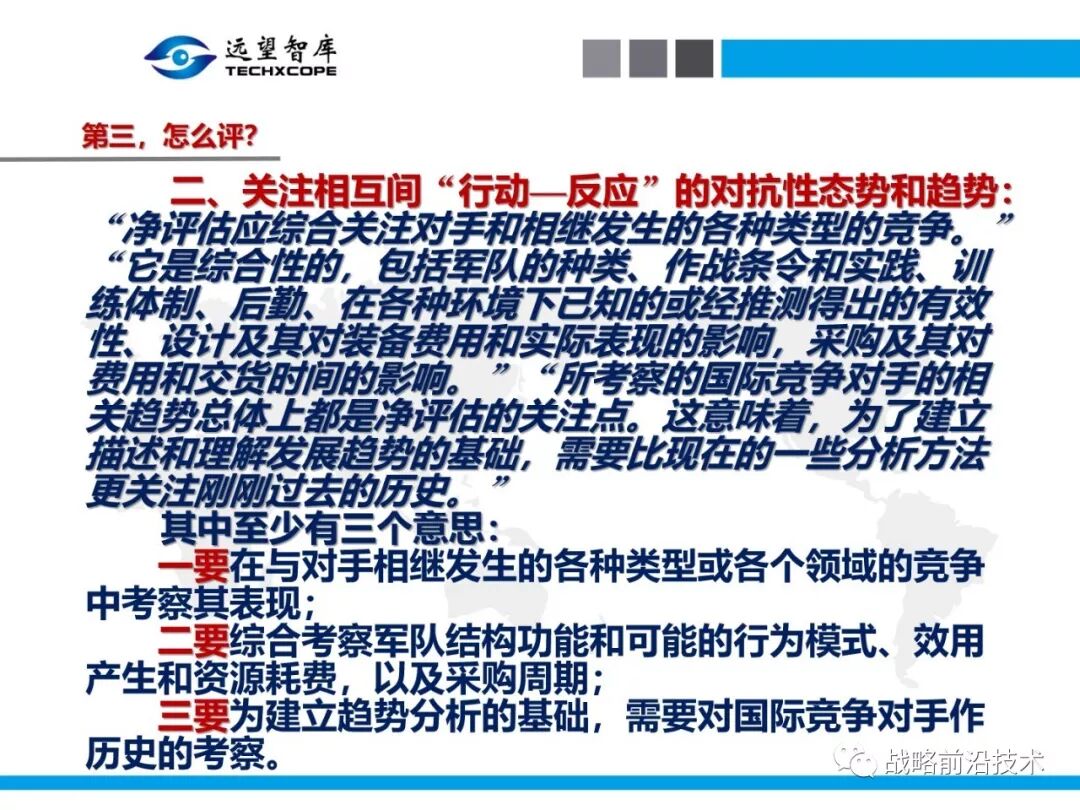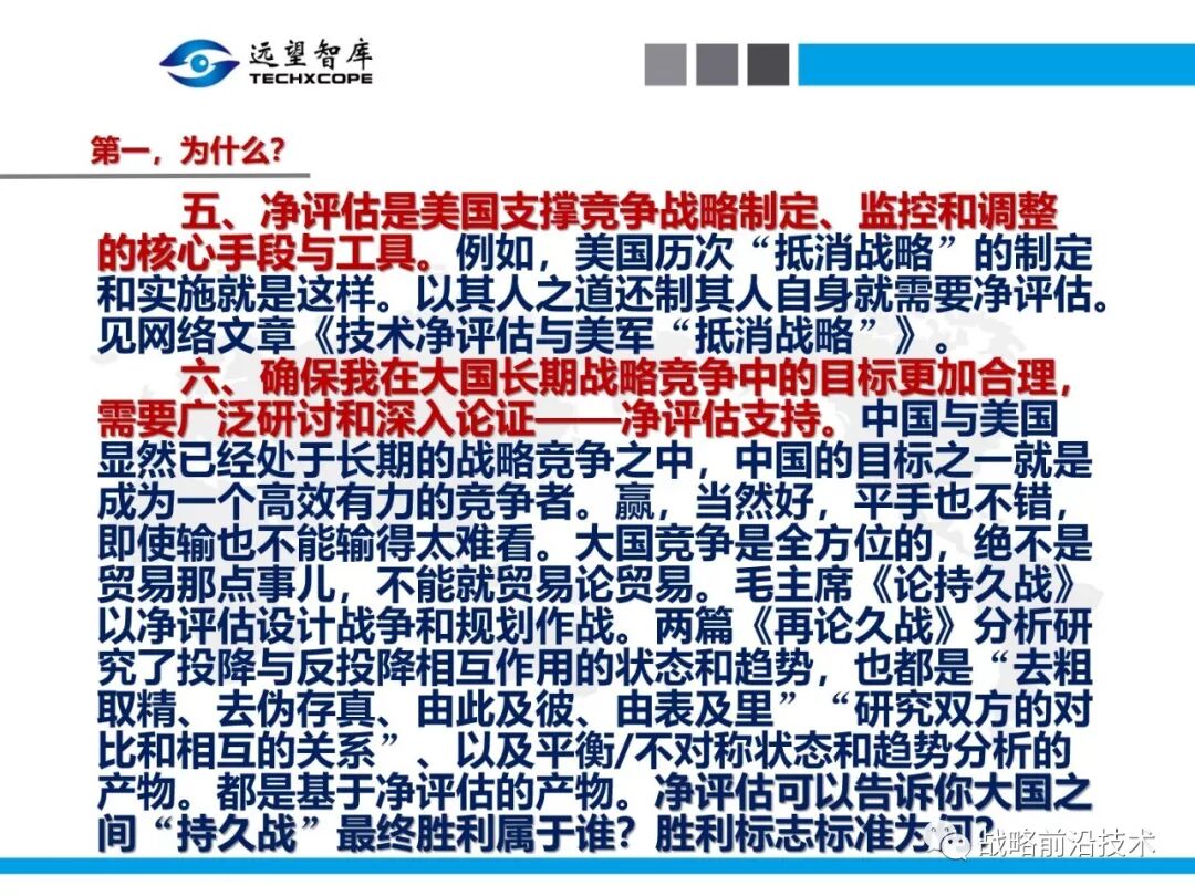 为帮助相关人员了解、熟悉、掌握和借鉴运用净评估思维理念及方法手段,深入研究探讨净评估与大国长期战略竞争的相关问题,远望智库于6月27日下午,以“净评估与大国长期战略竞争问题研讨”为主题,在北京中航广场举办了第七期“净评估十”学术沙龙。来自相关领域的专家围绕以下四个问题进行了研讨:一是为什么大国长期战略竞争要净评估?二是大国长期战略竞争的净评估评什么?三是大国长期战略竞争的净评估怎么评?四是大国长期战略竞争的净评估案例介绍,以及启示与思考问题。应相关人员要求,现将本期学术沙龙开始时的引导发言PPT部分稍加整理、增强可读性,并予以发布,仅供参考。