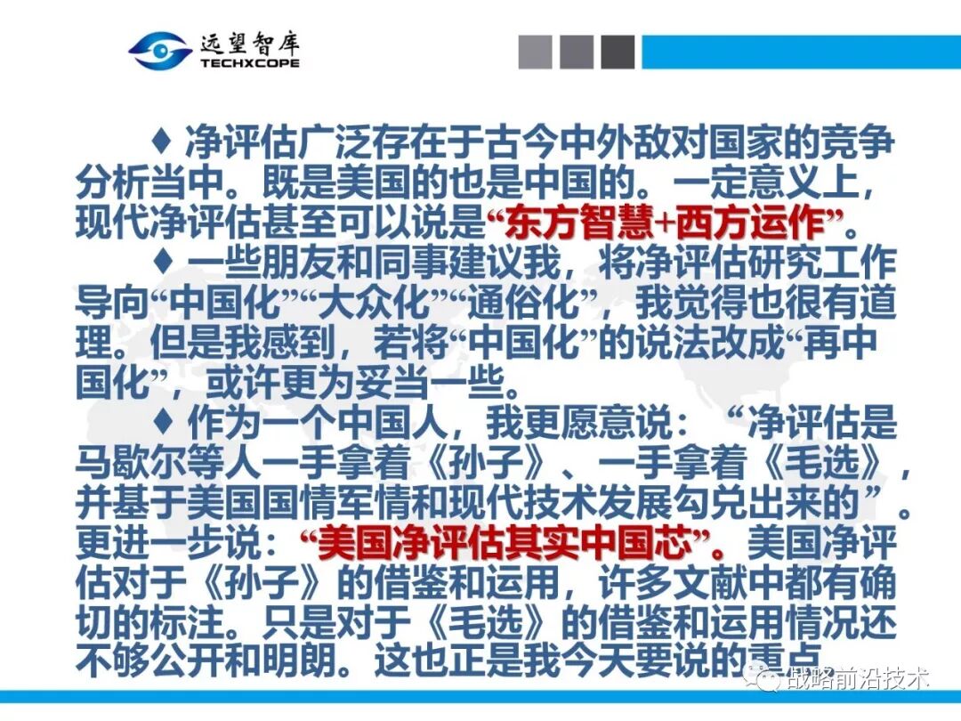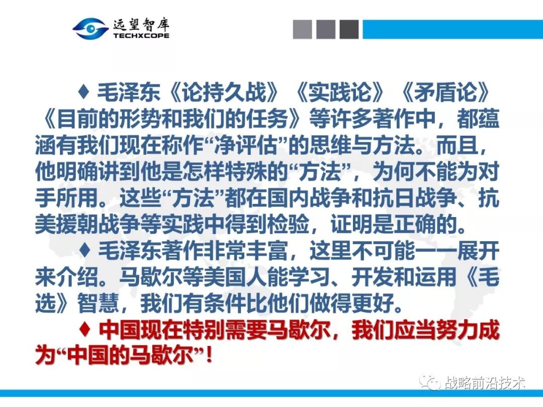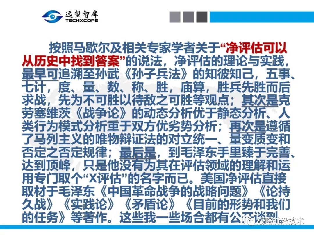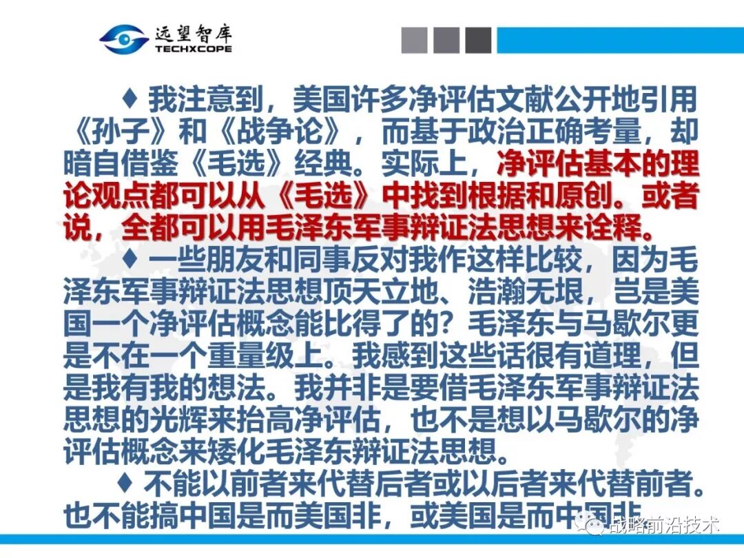 7月6日,知远战略与防务研究所在上海虹桥举办了“净评估方法与实践研讨会”,来自相关领域的60余名专家学者全程参加了活动。远望智库净评估中心主任、首席专家易评估应邀出席,并以“毛泽东军事辩证法思想与马歇尔净评估概念之比较研究”为题作了学术报告。应相关人员请求,现将其现场报告PPT整理发布如下,仅供参考。