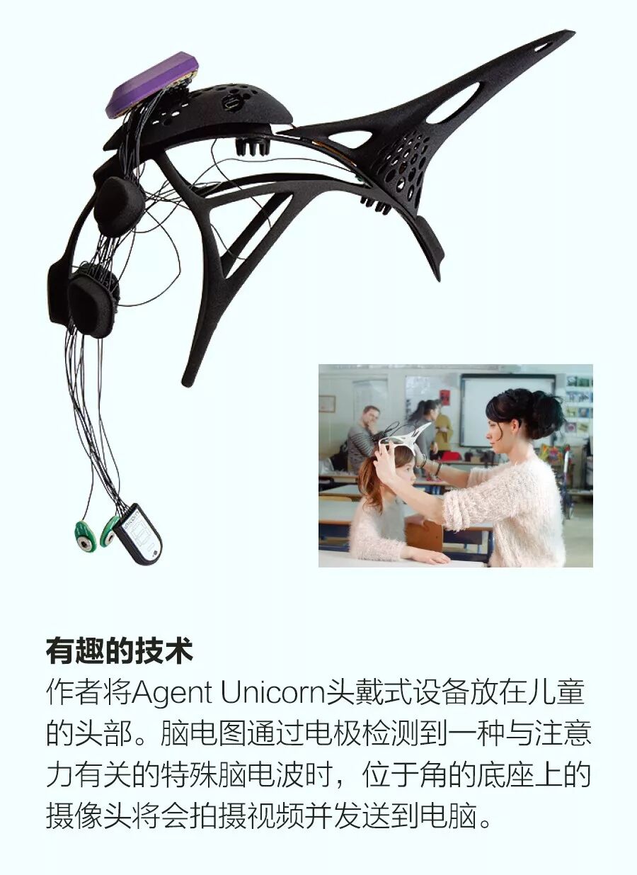 我的目标是开发一种设备,通过监测患儿的大脑及其所处的环境来提供相关研究所需的数据。之后我设计了“独角兽代理人”(Agent Unicorn)——带有一个突角的头戴式设备。它的突角中装有一个800万像素的相机,能够在头戴式设备内置的脑电图检测到P300事件增加时拍摄视频。该设备的外形经过特别设计,可以自动将电极定位到头盖骨上的正确位置。