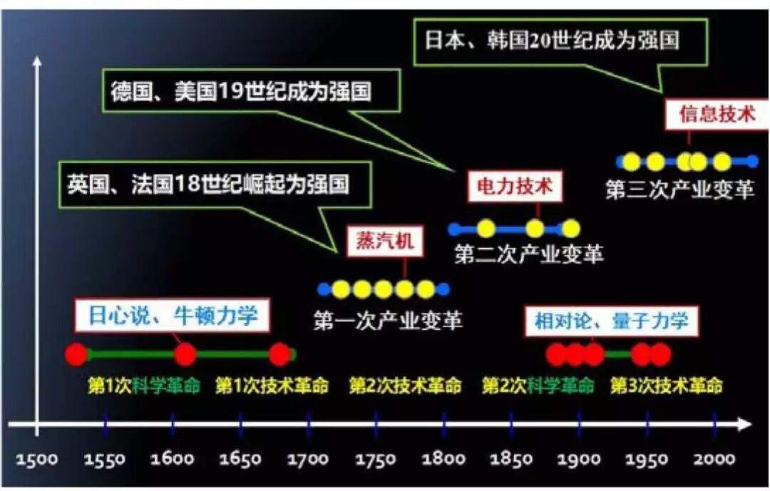 1550年到1700年,日心说、牛顿力学开启了第一次技术革命和第一次科技革命。1750年到1800 年,蒸汽机的发明引发了第一次产业变革,掀起了第二次技术革命浪潮,使英国、法国崛起为18世纪强国。1850年到1900年,相对论和量子力学的发展,促进了电力技术的发展,打开了第二次产业变革的通路,促使德国和美国成为19 世纪强国。1950年到2000年,信息技术点燃的第三次技术火炬,迅速燃起第三次产业变革的熊熊烈火,使日本、韩国成为20世纪强国。