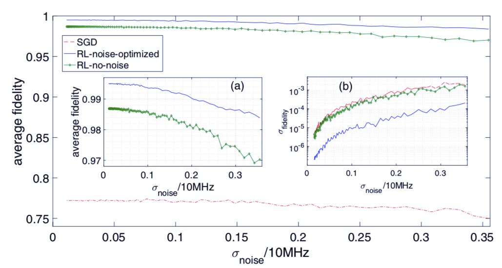 优化量子控制机制和高斯控制噪声方差方法(红色线)在量子门 N (2.2, 2.2, π/2) 下的平均精确度对比。其中蓝色为增加了训练环境噪声的结果,绿色则没有噪声。小图 a:有无噪声情况下的精确度对比放大图。小图 b:噪声增大时,精确度的方差值增长情况。