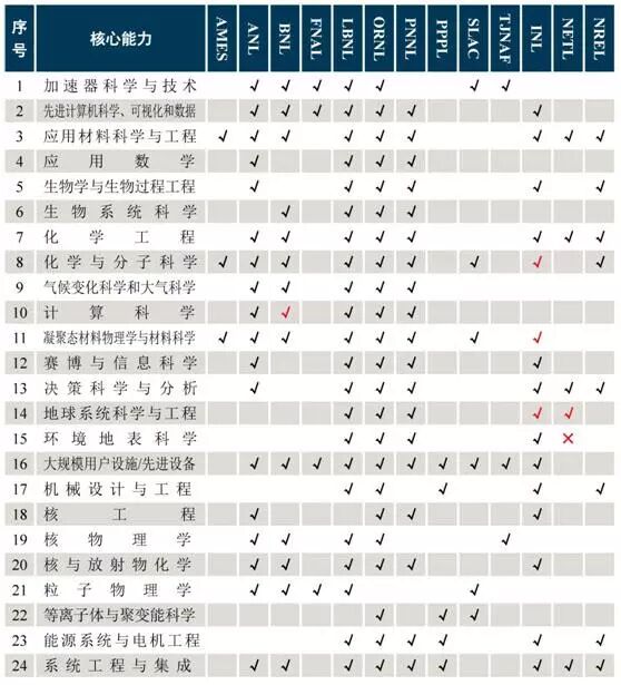 核心能力体系在各个国家实验室中的分布情况(标红色的“√”表示2018年新增,标红色的“×”表示该实验室的