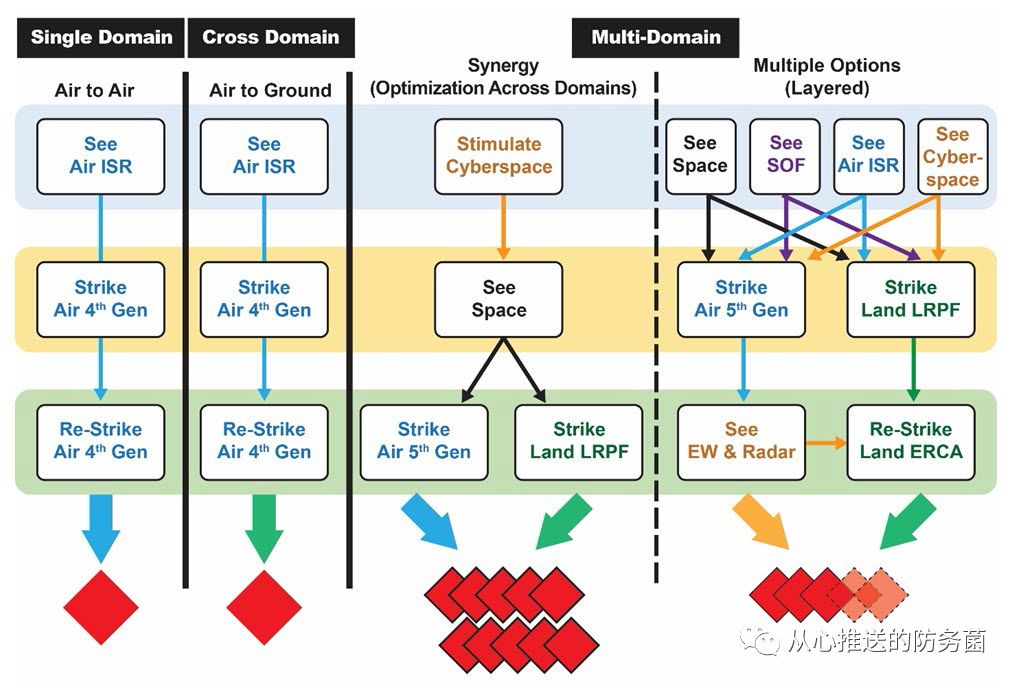 与单域选择相比,融合有两个优点:跨域协同创造了超强匹配,多个攻击形式在作战域之间创建分层选项,以增强对友军作战能力,同时增加敌军面临的复杂性。融合跨域能力使联合部队能够激发、感知并打击中俄系统中的弱点,并挫败他们制造对峙僵局的努力。目前,联合部队通过多域联合解决方案的阶段性同步融合能力,但在未来,将不得不持续快速地整合由任务指挥和有纪律性的举措支持的多域能力,以应对匹敌对手的威胁。![]()