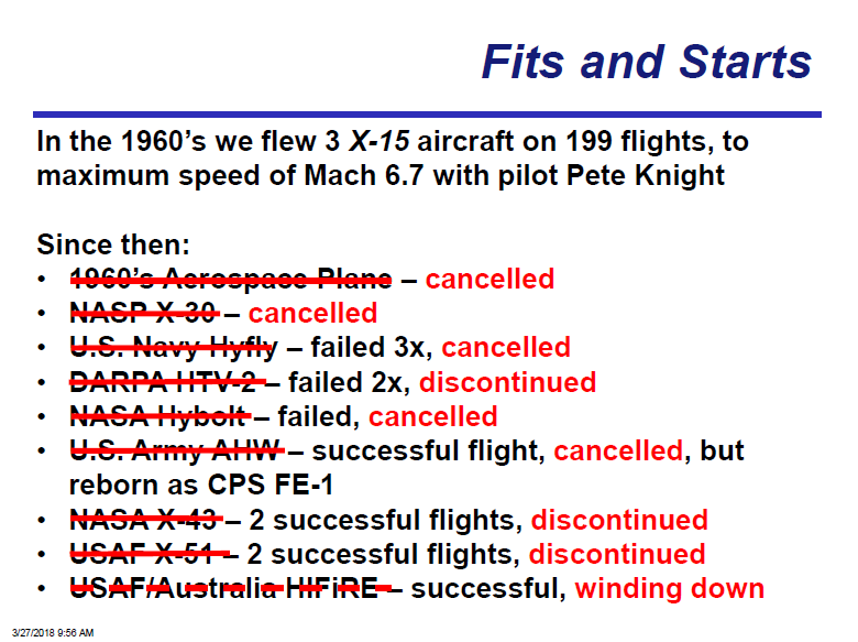 21世纪以来,美国启动了数量众多的高超声速预研项目,但努力是断断续续的,缺乏持之以恒的目标牵引——海军的Hyfly试飞三次失败后取消;HTV-2试飞两次失败后研究中断;NASA的Hybolt项目失败后被取消;X-43项目,两次成功试飞后因NASA战略转型而导致研究中断;X-51项目,4次试飞后研究中断;美澳合作的Hifire计划,总体上成功,但近年来放慢了进度。