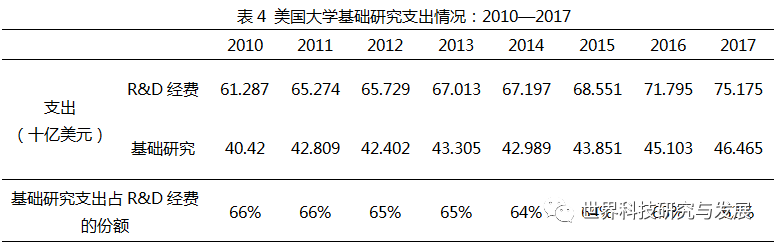 美国基础研究、应用研究、试验发展占R&D经费的比例在1970—2000年之间大致百分比为15:22:64。进入到21世纪后,基础研究的比例上升,应用研究比例下降,试验与发展的比例基本保持不变,三者比例大致为17:20:63。2017年美国的研发支出初步汇总金额为547.9亿美元,其中基础研究支出为91.453亿美元,基础研究投入强度达到16.7%。(表1)。