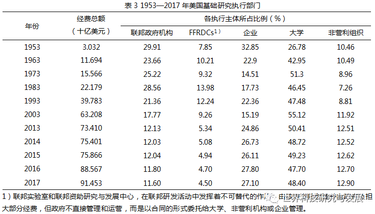 国外对美国基础研究发展状况的研究,一是来自美国科学基金会(National Science Foundation,NSF)。美国科学基金会除了在每两年发布一次的《科学与工程指标》报告中分析美国研发活动时对基础研究发展状况进行描述外,还在其他报告中对美国大学(基础研究中承担主要工作的机构)的基础研究发展状况进行专题分析,如美国科学基金会2009年的报告《联邦政府是科技大学研发经费的最大来源》、2010年的报告《大学报告:2009财年550亿美元的科学和工程研发支出》、2018年的报告《NSF 2017财年业绩和财务亮点》等。二是学者关于联邦政府对美国基础研究支持的研究。理查德.纳尔逊(R. R. Nelson)在《基础科学研究的简明经济学》中认为基础研究具有特殊性,其外部性、不确定性会导致市场失灵,因为企业投资该领域不一定能获益,在这种的情况下,基础研究的发展离不开联邦政府的介入。格拉汉姆和戴蒙德合著的《美国研究型大学的兴起:战后年代的精英及其挑战者》一书,分析了联邦政府对研究型大学提供的基础研究经费及制度支持,阐释了研究型大学在基础研究中的重要地位。Christine M.Matthews在其2012年向国会提交的研究报告《联邦政府对学术研究的支持》中分析联邦政府对大学基础研究的投入。