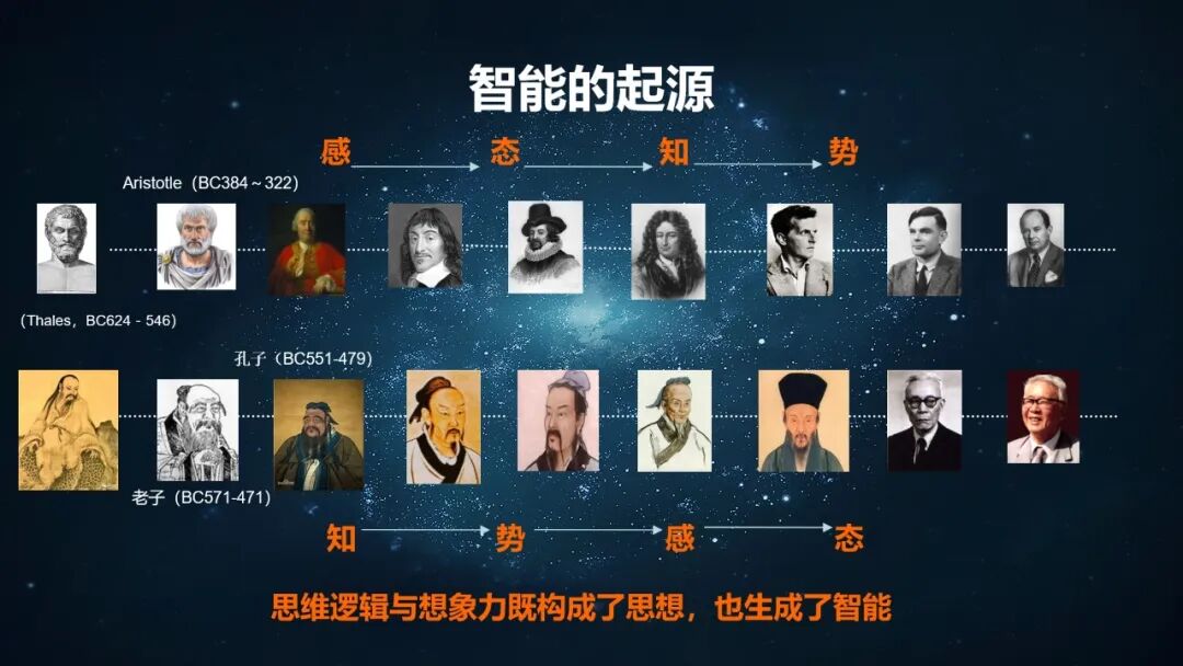 东方最后这两位先生简单介绍一下,金岳霖先生是学西方哲学,做数理逻辑做的很好,是最早把西方逻辑介绍到我国的先驱之一。后面是华罗庚先生,没有华老就没有中国的计算机和中国的人工智能,最早提出跟踪世界新技术做计算机的时候,是由他提出来的。蒋介石当时派华老去美国学先进技术,冯诺依曼做计算机,华老看到计算机计算的能力后就力主中国也要搞,结果蒋介石去台湾了,共产党来了,华老回国后在清华找了几个人,把中科院计算所搞起来了,中国最早的计算机现仍在曲阜师范大学,大家去孔府孔庙的时候可以顺便去看看,机器还健在。大家要追中国计算机和人工智能的根,可以追到华老身上。后来中国社会科学院有一些老先生一直在追踪前苏联和欧美维纳控制论思想,点燃了中国的人工智能之星星之火,后来一些做计算机和自动化的老师们才逐渐开各种会议、成立人工智能方面的团体等等,做学问一定要挖根,找到真正根源才能长大,不然人云亦云,智能的科学起源是什么?智能的哲学起源是什么?技术起源又是什么?不是1956年,1956年是一个表象,AI这个概念据一个朋友考证,不是达特茅斯学院那几个人提出来的,而是英国的一位数学家写信告诉了那个人,那几个人才用了AI,国内现在对此有点乱,还没有学会朔源,只追到最根本的地方才能产生出中国真正的智能,尤其对中国古代非常好的东方思想、大量智慧性的东西,挖掘的远远不够,只看到一些做商品、做系统的,那不是这样的,那是应付性的,那是挣钱的,真正不为了单纯挣钱的时候,中国的人工智能才能够茁壮成长,否则,你会很难做出事来。