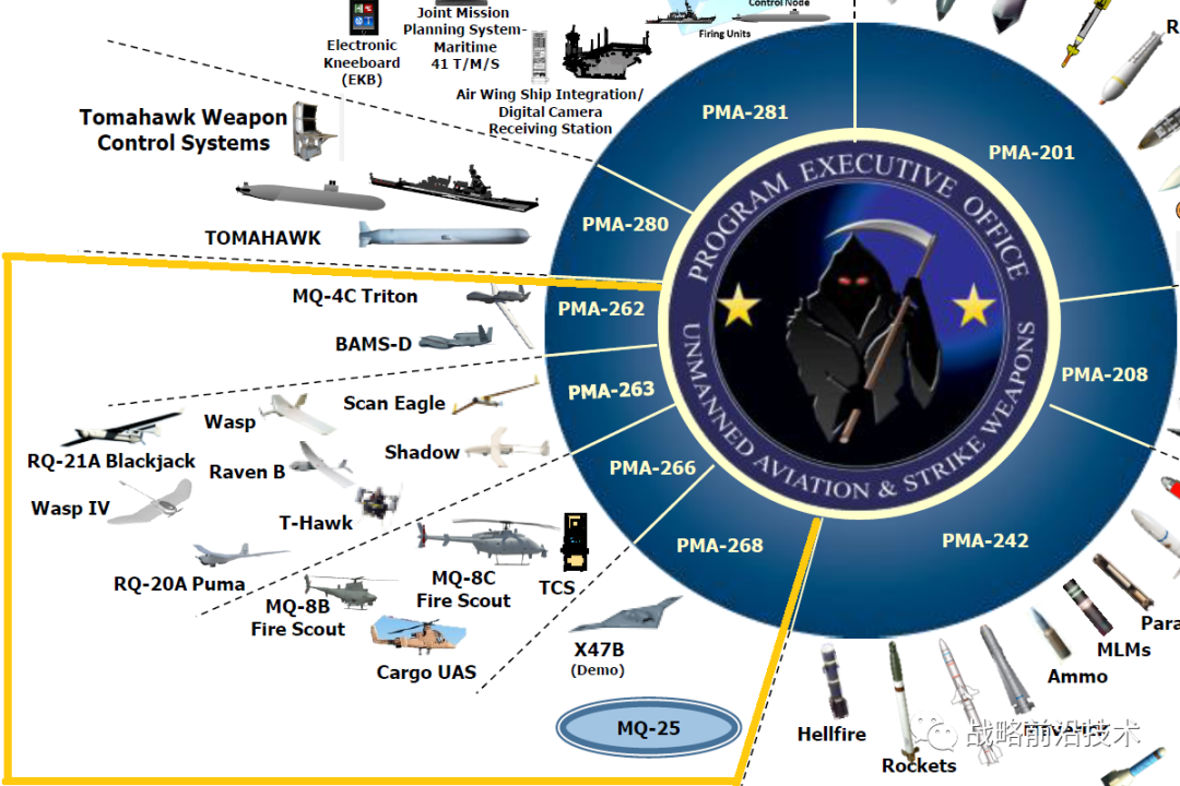 美国海军的无人机系统采办由海军航空系统司令部(NAVAIR)下属的“无人航空与打击武器”项目执行办公室(Program Executive Office, Unmanned Aviation and Strike Weapons, PEO U&W)负责分管,其职能定位是迅速发展、采购和支持高质量的空对地打击武器、无人飞行器和目标系统。PEO U&W下设多个项目办公室,其中PMA-262/ 263/ 266/ 268分别负责不同类型的无人机系统,如表 22和图 25所示。 | | |