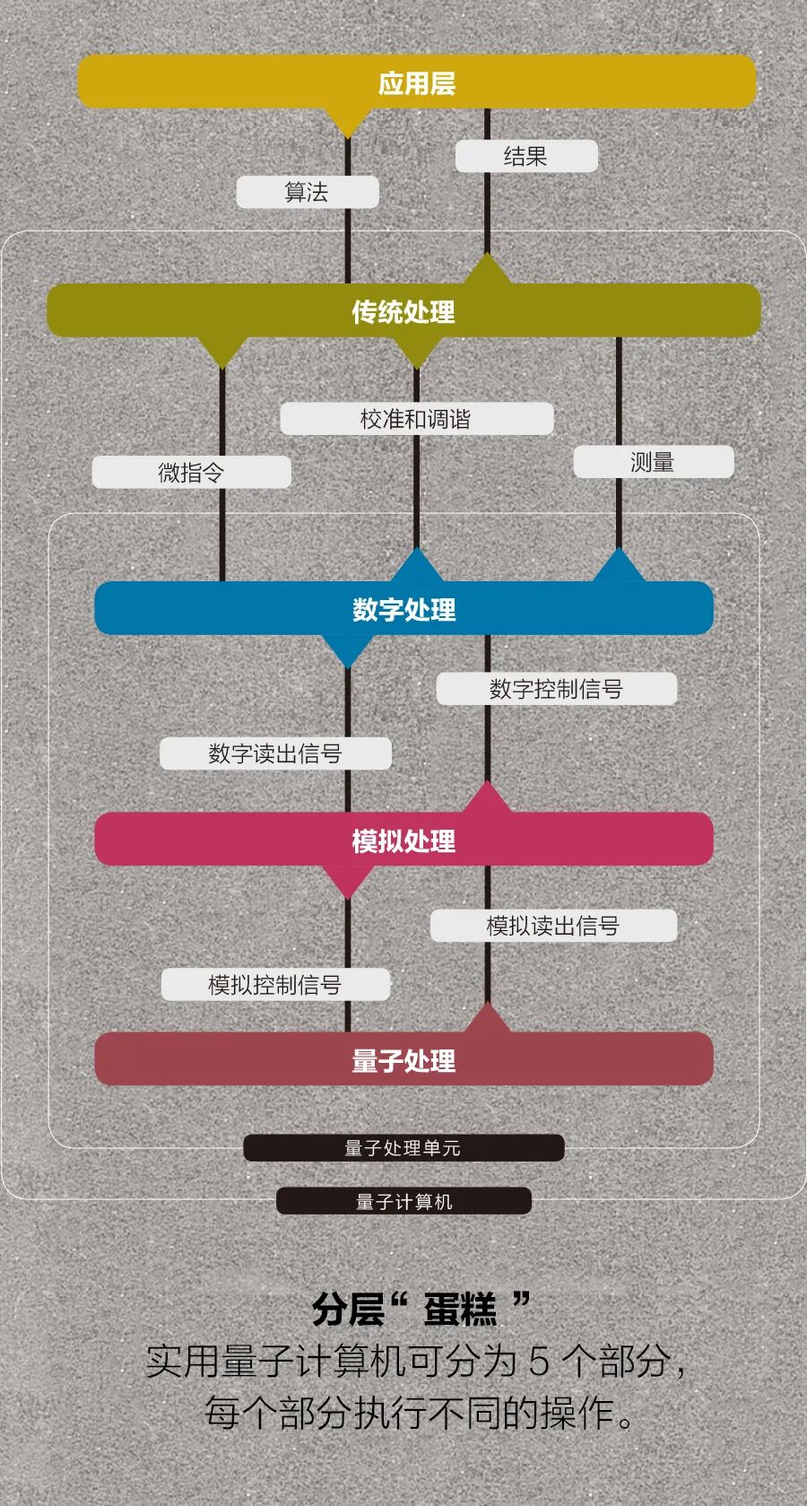 量子计算机发展的下一阶段,应用层的建造会相当直接。数字处理层也将相对简单。而建造组成量子处理单元的3层会很棘手。