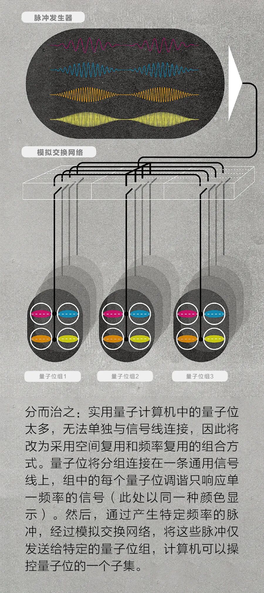 该解决方案可能涉及频率复用和空间复用的组合。将量子位编造成组,组中的每一量子位被调谐到不同频率。计算机包含许多这样的量子位组,所有量子位组都连接到一个模拟通信网络上,模拟层生成的信号仅连接到一个选定量子位组子集。通过正确分配信号频率和网络连接,你可操控单个或一批目标量子位,而不影响其他量子位。