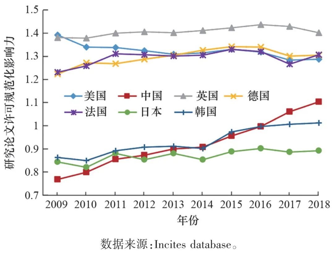 世界主要国家近10年研究论文学科规范化引文影响力