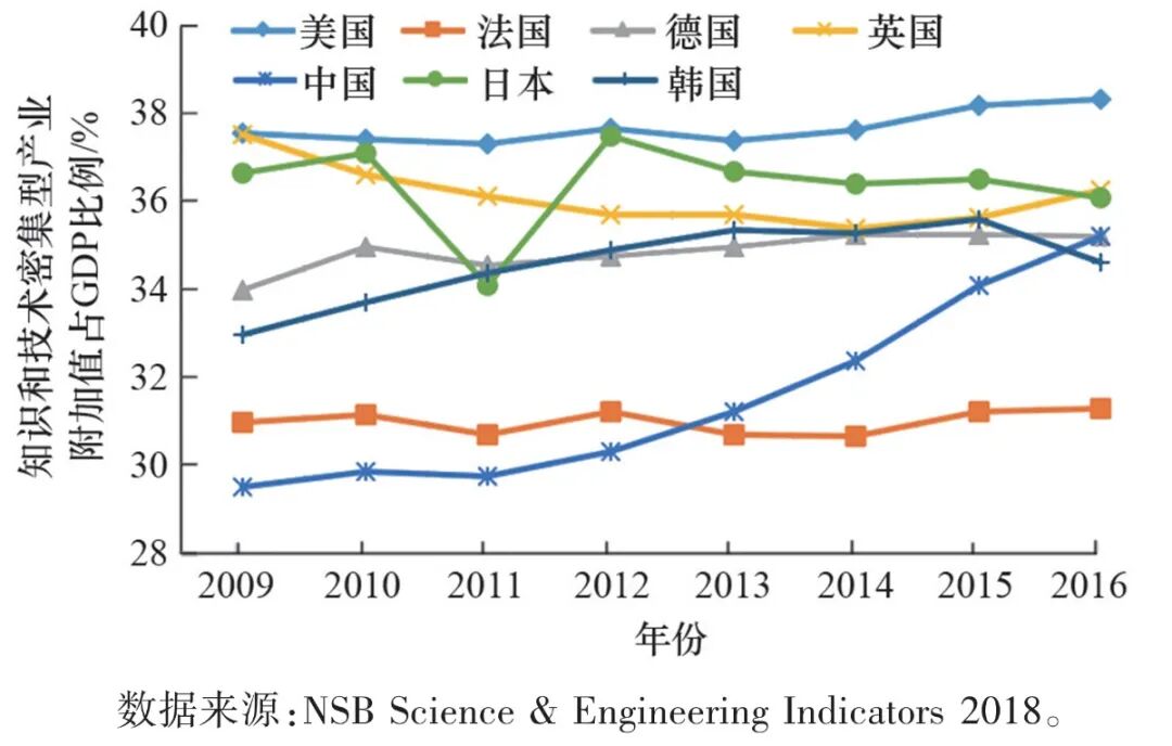 世界主要国家近年知识和技术密集型产业附加值占GDP比例