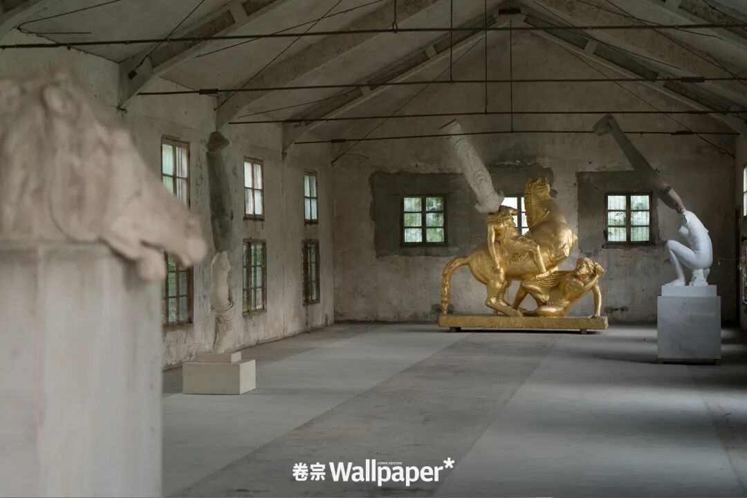 而徐震® “永生” 系列的另一批神祇,则集结在主路尽头一侧的又一处农舍中。这些 “暴力拼接” 东西方神话经典的雕塑,在斑驳的墙壁与光影中竟流露出一种惊人的和谐与宁静。屋外远处的林间空地上,被 “一劈为二” 的恐龙雕塑被分别陈列在两只巨大的展示柜中,似乎有超能力者于此衔接了古与今。毗邻黄浦江的沙洲野地,这场常设展仿佛逸出人类纪,让这里充斥着有关远古众神与古老生物的传说。