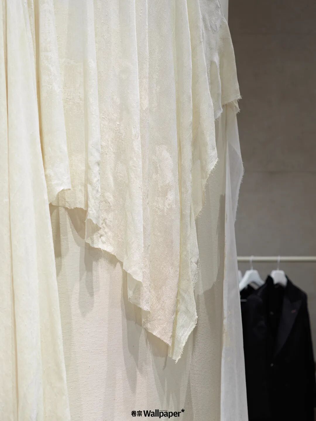 建筑师团队将织物缝合在一起,以使原本柔软的面料被赋予结构的“刚性”,将其悬挂后即可进行填充;当内部的石膏铸件尚未定型,团队也可以通过向织物外部施加约束,以获得更加多样的造型和状态,也是将物质凝固在流动的状态里。模具拆除后,这些背景墙与立柱表面仍然能看到织物的痕迹,体现了“半成品”般的效果,种种创作过程中所产生的化学反应,灵光乍现和莫测变化都被完美瞬时定格。除了浇铸石膏立柱及背景墙本身的不规则形状,部分甚至直接在“墙上”嵌入品牌成衣中所使用的纱质面料,与整体相对硬朗直接的陈列设计形成对比的同时,进一步体现随性与“未完成感”(Work-in-progress)。