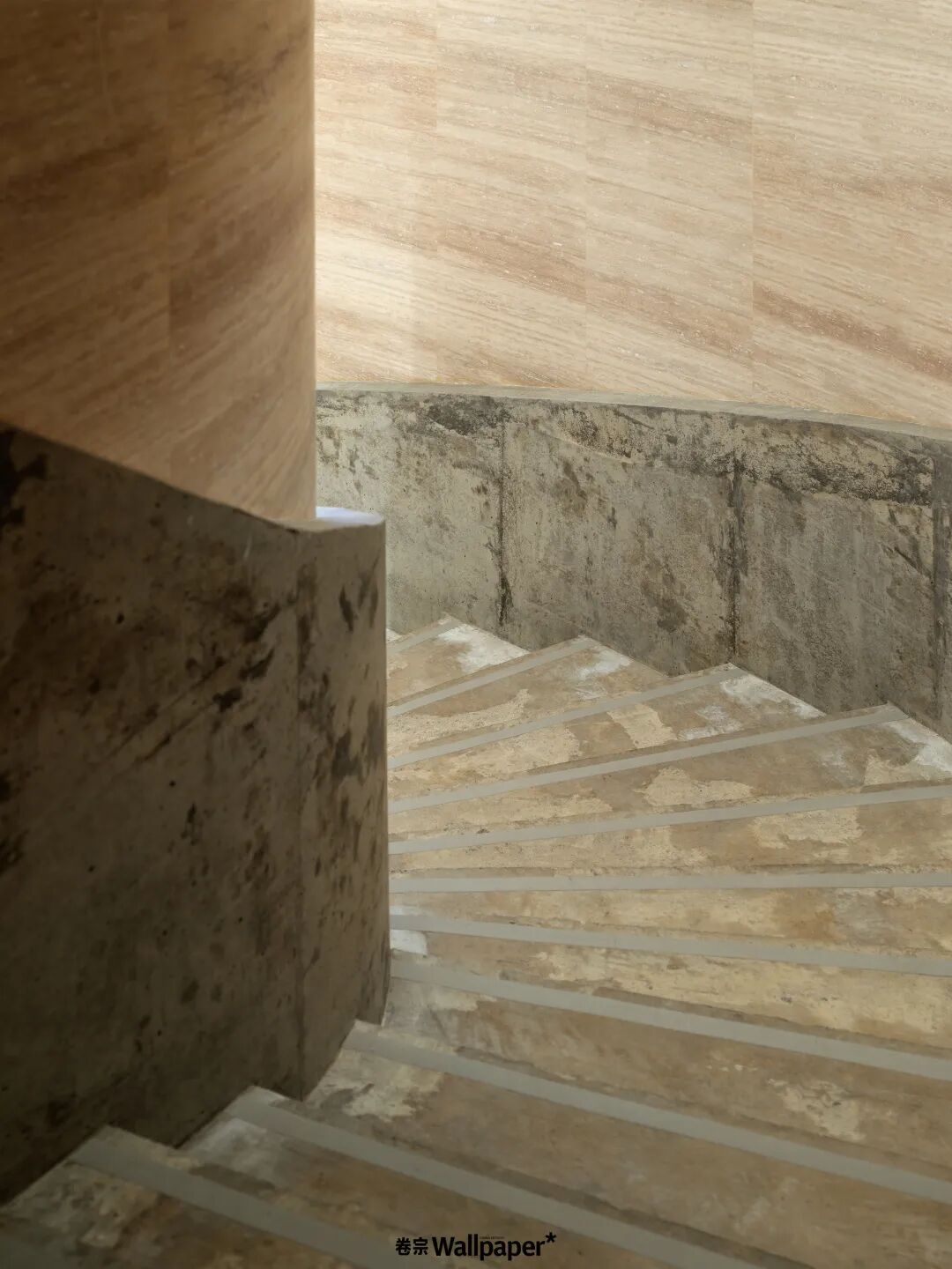 由旗舰店一层通向二层的主楼梯由灰色混凝土制成,用简单朴素的材质浇筑出“宏伟”之感,设计师将其粗粝的表面完整保留,不加掩盖与修饰,进一步加强空间中材质的对比。本应被隐藏在墙壁内部的质朴灰泥,则将建筑结构巧妙遮蔽,将两种本质上截然不同的元素进行互相转换,一语双关,既是“将不合适变成恰到好处”,也同样是一种“内衬外露”。