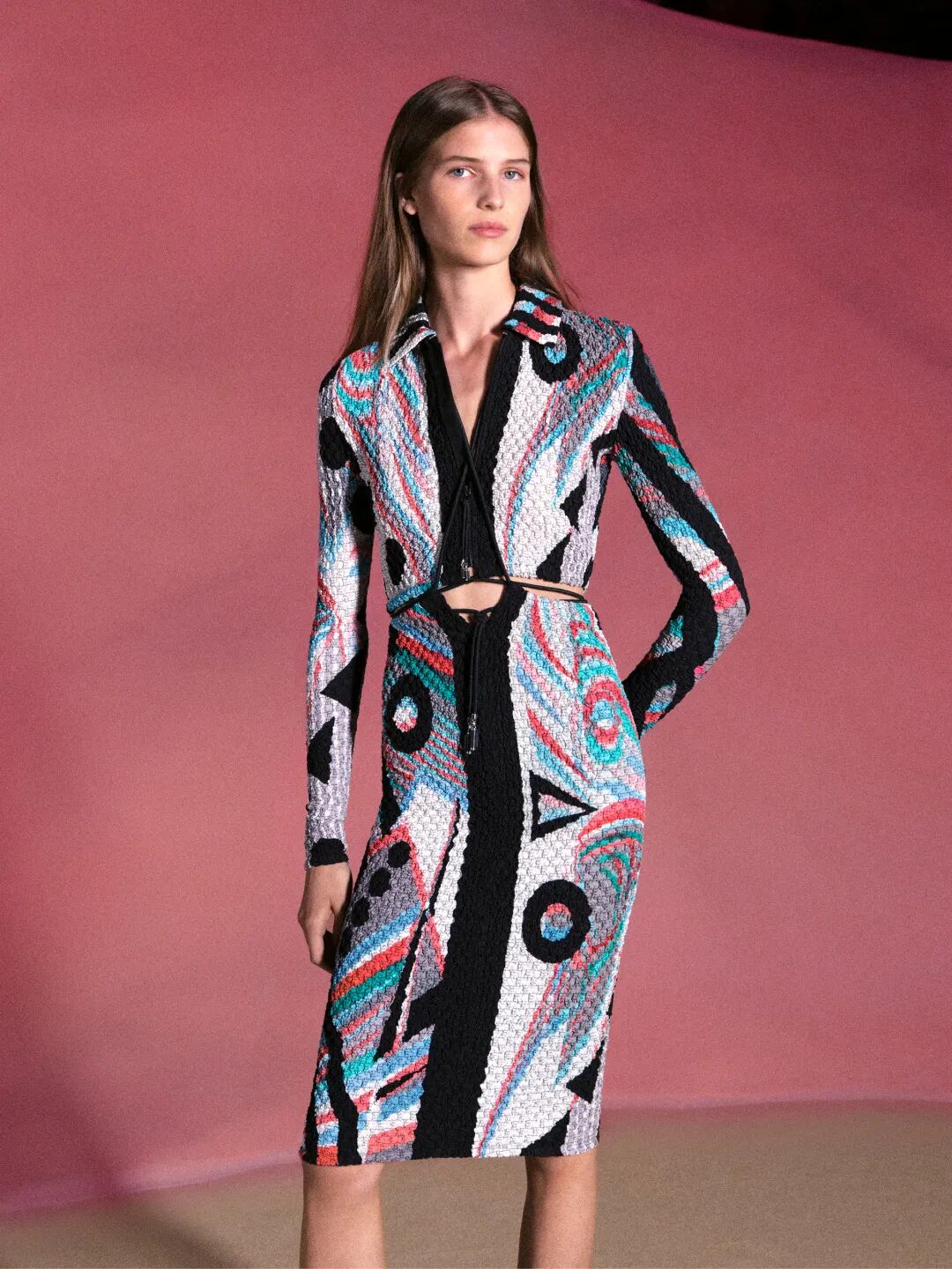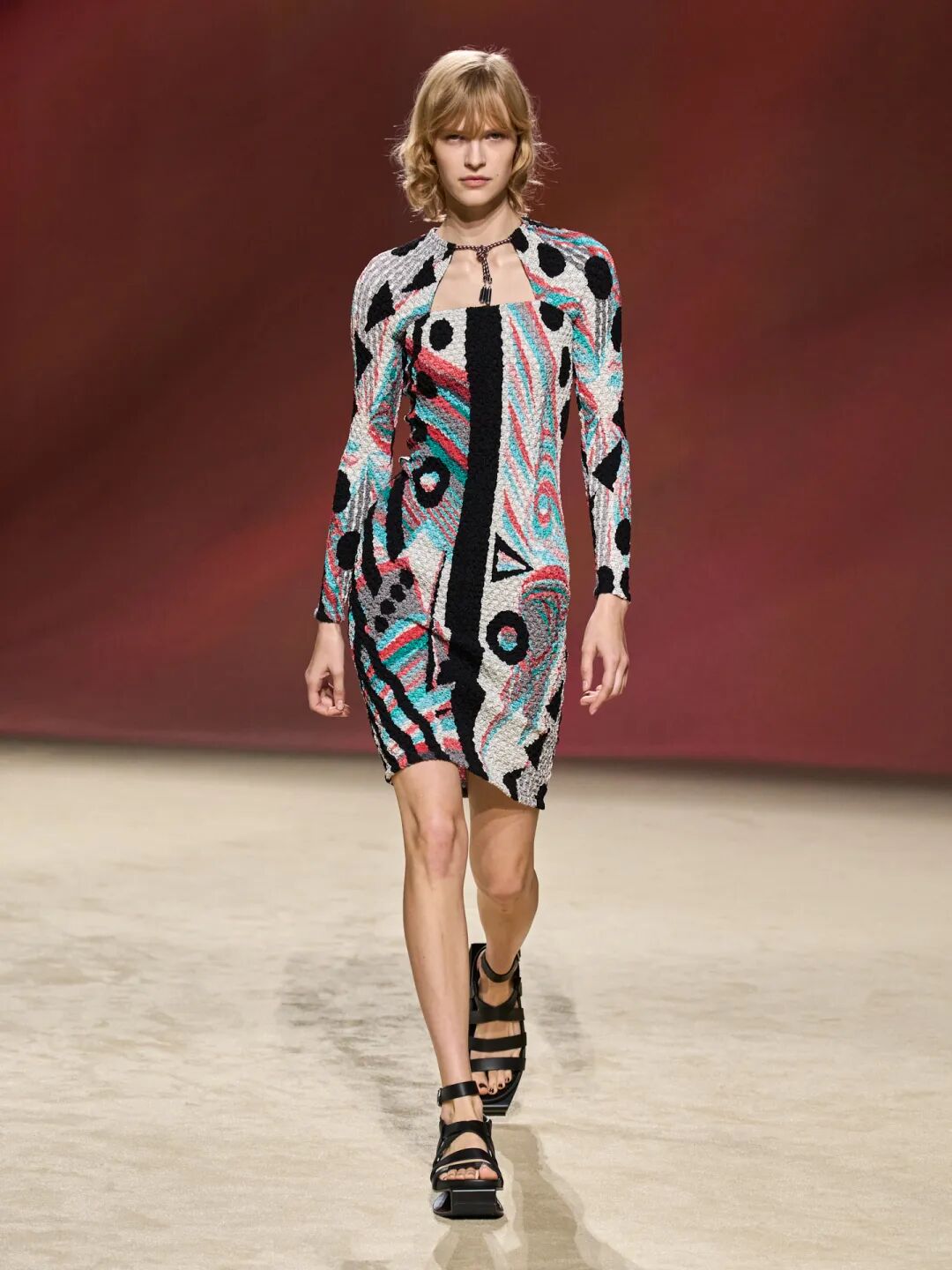 连模特都是充满力量感的,她们露出鲜明的大臂线条,踩着由Pierre Hardy设计的科技感半挖空凉鞋而来。而连衣裙上由圆圈和弧形线条拼凑而成的印花,更仿佛来自于神秘主义艺术家或是某种原始部落的图腾——你不知道这无名的神秘力量从何而来,却不自觉被吸引。