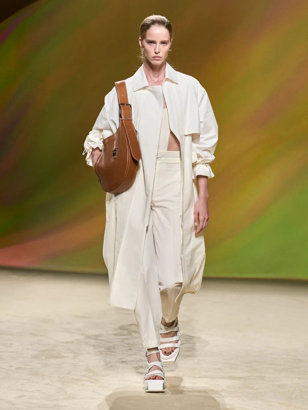 当然,这毕竟是Hermès。整个系列中穿插的纯白与深深浅浅的米白依旧指示着一种不动声色的恬淡与散漫,实用主义因素流淌于没有情绪负担的平静底色之上。此处,Nadège Vanhée-Cybulski想讨论的大概率不是某种阶级的穿着方式与生活方式,而是借由时装刻画着一种当代情境下的女性自由与人类情感。