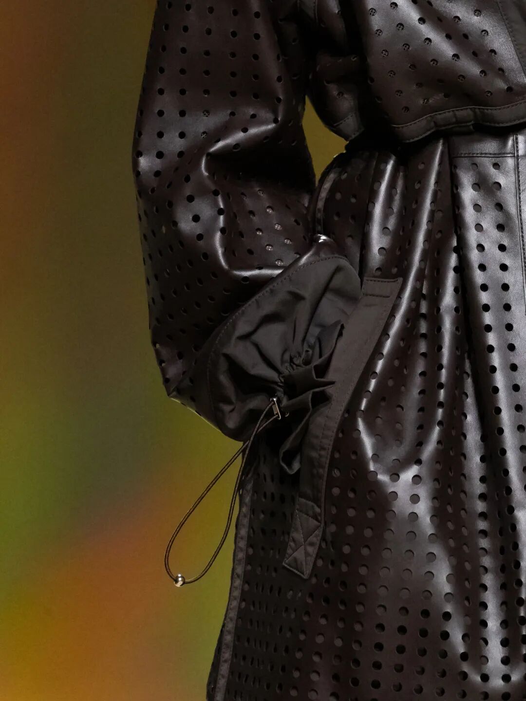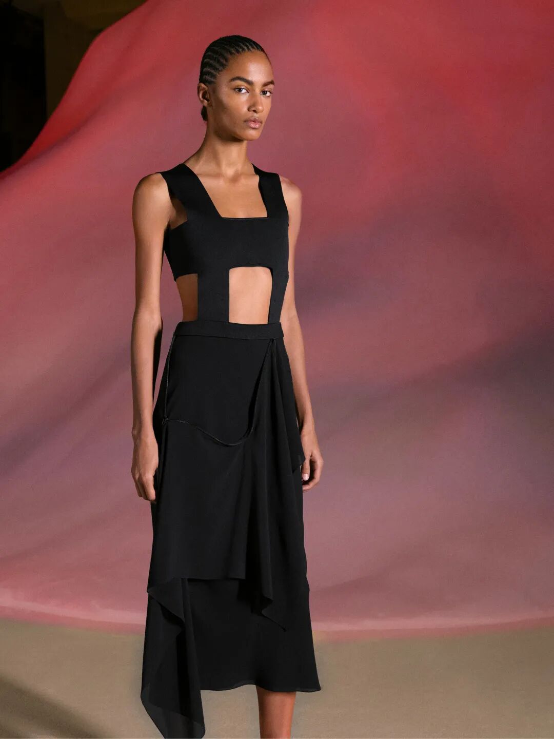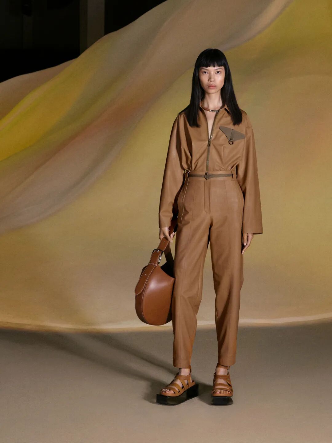 她延续着人类几千年来的制衣传统,也继续着Hermès几百年来的品牌精髓,把柔软皮革化作神奇衣裳。赭黄色、乌木色、浅褐色、沙漠棕色、黑色……引入眼帘,涂抹沙漠之舞的缤纷想象。而将女性带至这无名的沙漠,或是一股神奇的无名之力。品牌继续写道:“她以编结绳索为介,令服装与外界及生灵对话”,那些仿佛从一面编网、一张吊床抑或一顶纱窗直接裁下的修长装束以及呈现镂空编织效果的短款上衣,无一不在诉说着回归原始的心声。