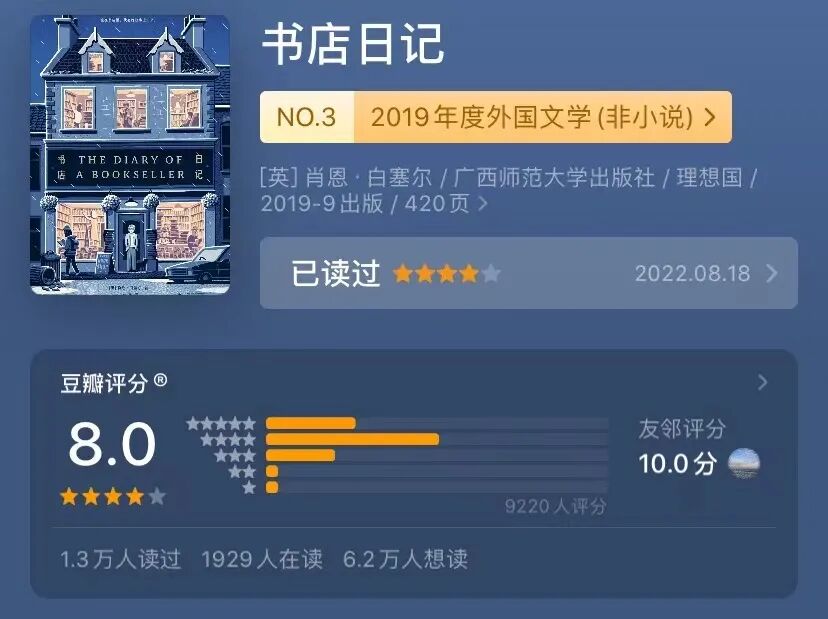 学妹从金融专业跨考北大中文系,当时一直在关注我的公众号,还常常给我留言,后来给我写信、赠书。喜欢信件,喜欢书籍,喜欢人与人的羁绊在信件和书籍上的具象化的呈现。《书店日记》,内容正如书名,是一个书店老板就书店的所见所闻记录的日记。话说,有篇日记提到迪伦·莫兰到店里买书,作者说“这下我有了他从我店里买书的视频。是弗洛接待他的。她冷静得让人生气。” 哈哈,迪伦·莫兰,是英剧《布莱克书店》的导演、编剧和主演,大家有空的话可以去看看,这部剧超级好笑!03
