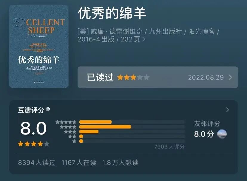 《优秀的绵羊》讲的是,传统的教育体制,只会培养出焦虑的、循规蹈矩的学生,作者鼓励独立思考、追求个人价值、实现使命。