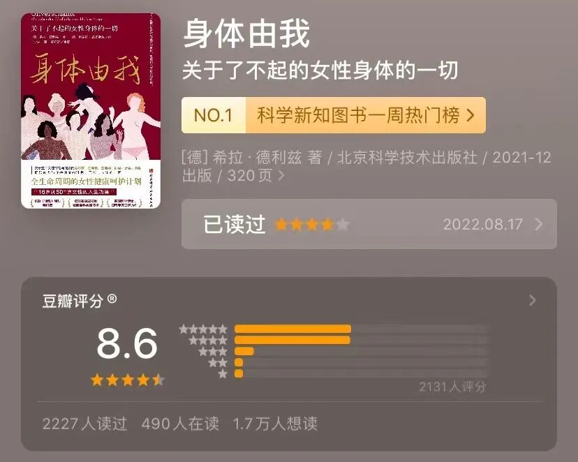 一部女性健康科普著作。作者是医学博士,在德国有自己的妇产科诊所。女性的一切活动几乎都离不开雌激素。……。它是让女性变得任劳任怨的激素,正是因为有它,女性才希望确保丈夫和婆婆感到舒适、孩子们穿好衣服并得到照顾,……。雌激素还使得女性愿意把自己的需求置于他人需求之后。啊?……这,或许有一定的相关性,但,有这么强的因果关系吗……更多的不是文化塑造吗?06