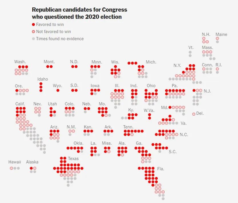 下图中每一个点代表按职位分类的共和党候选人。深红色点代表该候选人公开质疑2020年大选被窃;浅红色点代表该候选人以其它方式质疑2020年大选;灰色点代表《纽时》未发现任何证据。