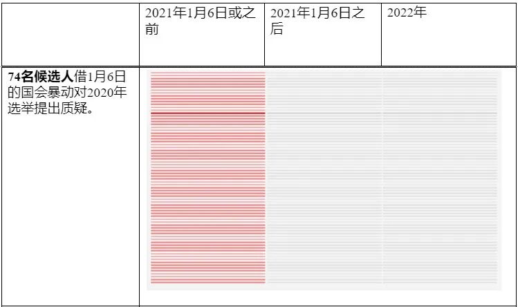 《纽时》的分析区分出几十名明确(但错误地)表示2020大选被窃取的候选人,以及那些不再说选举被窃,但经常批评选举的候选人。后者的方式看起来更合理,但造成的影响力或许更大。
