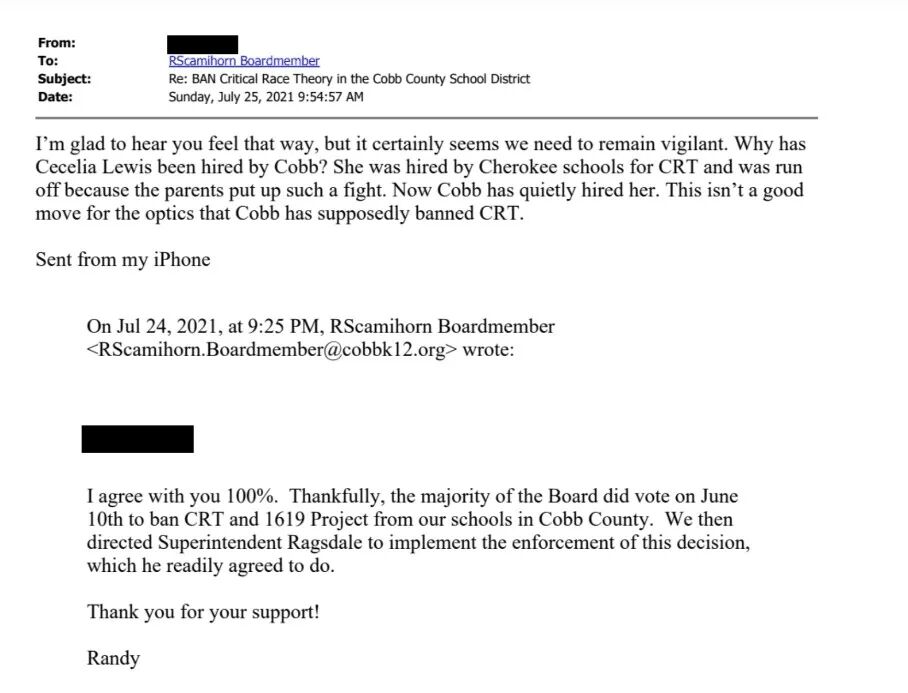 “我100%同意你的观点,“科布县学校董事会成员兰迪·斯卡米霍恩(Randy Scamihorn)回应说。”值得庆幸的是,董事会大多数成员确实在6月10日投票,禁止CRT和1619项目进入我们科布县的学校。然后,我们指示拉格代尔(Ragsdale)学监执行这一决定,他欣然同意这样做。”