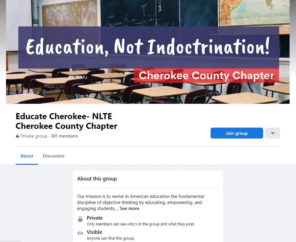 2021年8月,“教育切罗基(Educate Cherokee)”——一个网站现已关闭的团体,在脸书上自称是全国保守派非营利组织“教育不左转(No Left Turn in Education)”的地方分会(下图)——宣布它将举行一次活动。根据网上关于该活动的通知,该活动将由曾在会所和学校董事会会议上发言的赫达和曾在学校董事会会议上喊出刘易斯工资的拉尼领导。在通知中,该组织声称消灭“一个新的DEI行政职位”是其成就之一。“带上你的想法、能量和热情,”会议通知说。“我们需要将所有这些转化为有效的选举动力,让致力于我们事业的新的保守派取代所有即将连任的现任校董会成员,以消除CRT。”