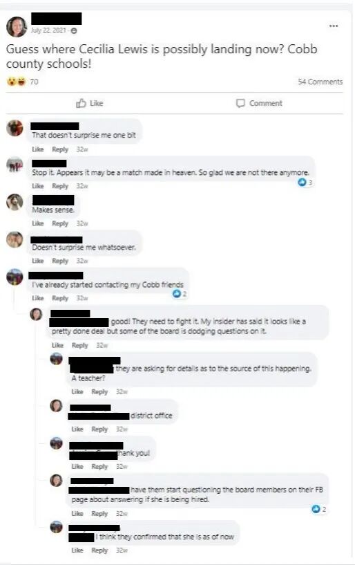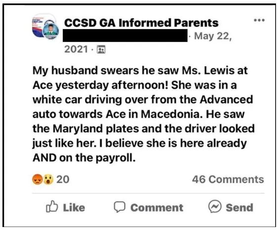 几个月后,使用脸书私人小组的家长开始抱怨刘易斯在邻近的科布县(Cobb County)得到了一份新工作。她被聘为该地区的社会研究主管,但她只在那里坚持了两个月,在该地区收到关于她试图通过CRT向学生灌输知识的错误投诉后,她辞去了这个职位。