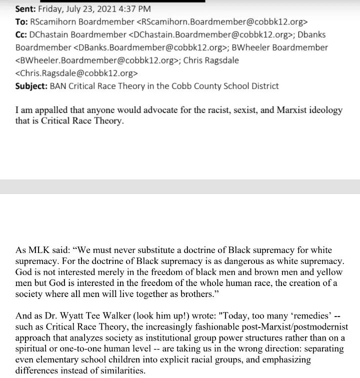 “我对有人会倡导种族主义、性别歧视和MKS主义的意识形态,即批判性种族理论,而感到震惊,”一位女士在一封电子邮件中写道(下图):“我坚持要求你们通过真正的政策改革,禁止在课堂上向儿童灌输CRT,” “任何被发现在科布学区推行CRT的人都应该被立即解雇,” “别搞错了:新闻稿和没有锋芒的决议是不行的。”