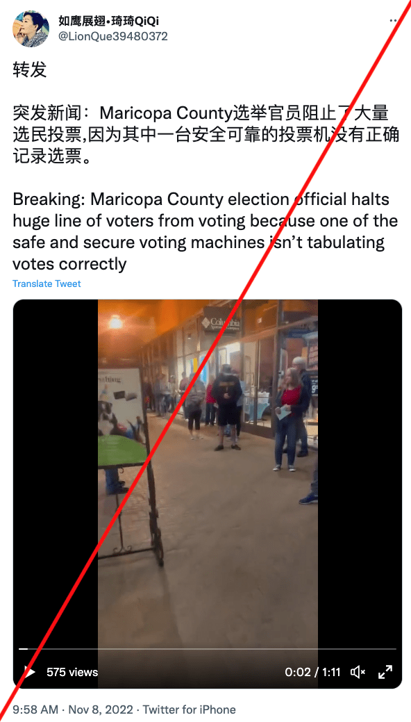 中期选举日当天,推特出现了大量关于亚利桑那州马里科帕县(Maricopa County)的传言。有人称:“马里科帕县的选举官员阻止大量选民投票”、“投票站等待时间2小时以上”等等。