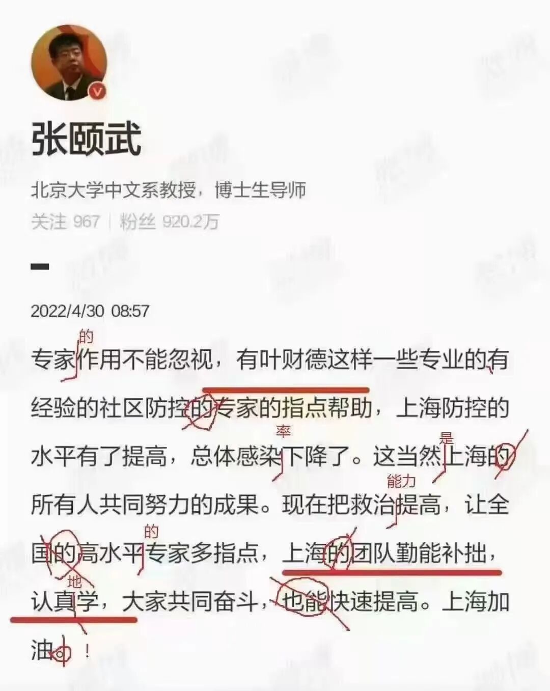 或许,吾国汉语文学圣殿的北大中文系教授张颐武,这个深受宠爱的御用文人,已经以这样低劣的文字水平和价值审美,给出了答案: