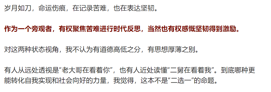 作为一个旁观者,有权聚焦苦难进行时代反思,当然也有权感慨坚韧得到激励。