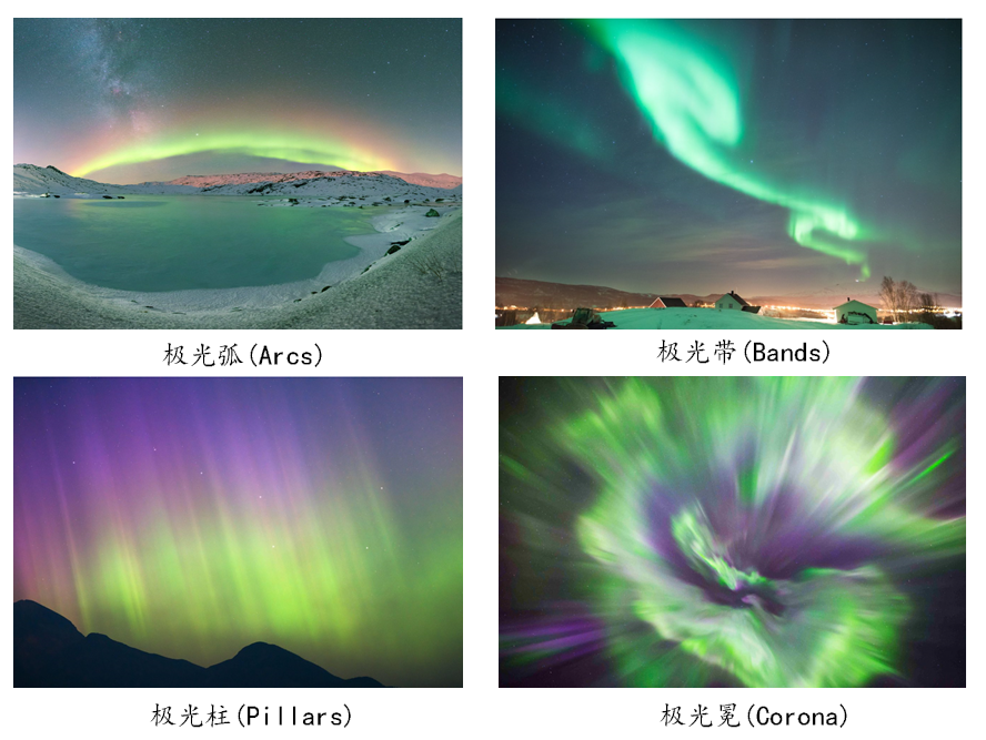 图1. 地球上各种形态的极光