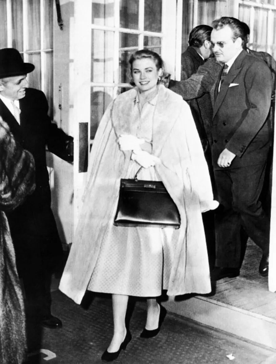 1956年,摩纳哥王妃、好莱坞影星格蕾丝·凯莉被狗仔拍到怀孕时,第一时间用包包挡住孕肚。