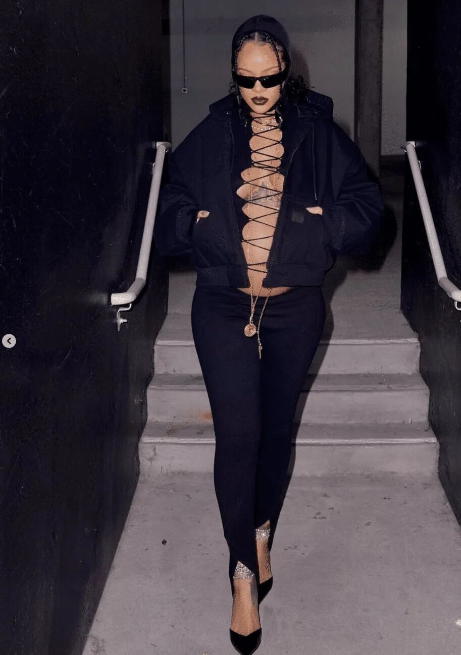 宣布怀孕后没过几天,蕾哈娜就被狗仔拍到一个人出街。她身穿法国设计师让·保罗·高堤耶的黑色绑带外套,从脖子一路露到小腹。