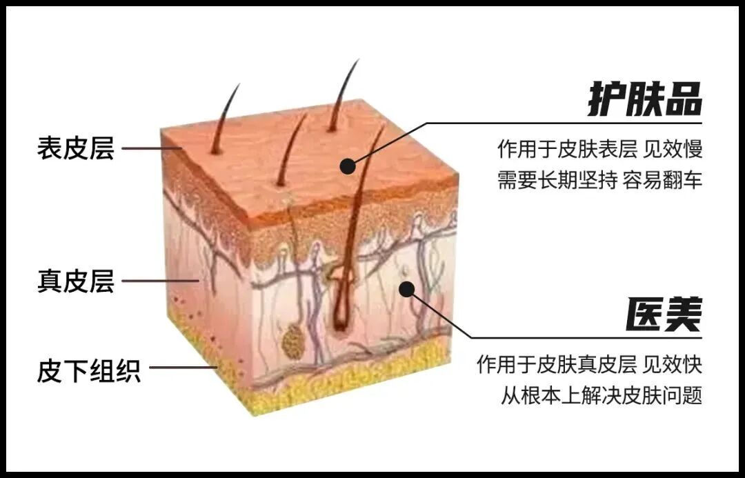 再贵的护肤品,也只能作用于表皮层。还不如直接去做光子嫩肤这样的轻医美项目,可以作用于真皮层,从根源解决问题,见效还快。