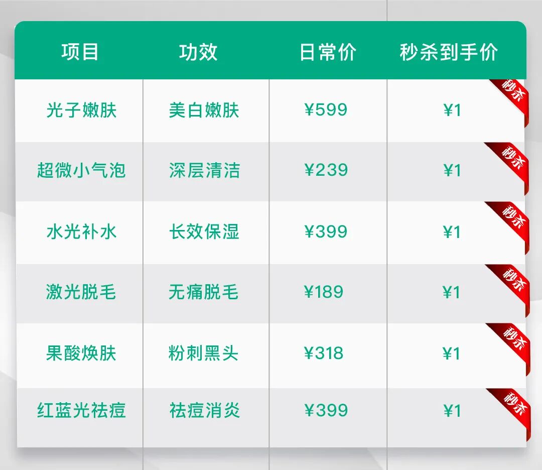 除了光子嫩肤外、超微小气泡外,还有很多热门项目,比如水光补水、红蓝光祛痘、果酸焕肤,大家戳下面的图片了解一下,看看有没有你感兴趣的项目,反正只要1块钱。