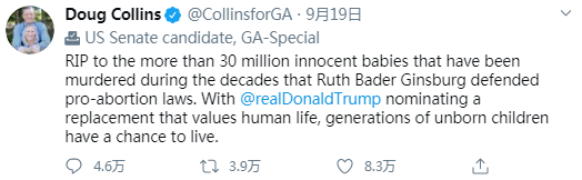 昨天我在推特上看到乔治亚州的一位参议员说,他希望那些因为金斯伯格确立的女性堕胎权而死掉的三十万婴儿能够 rest in peace,这就非常明确地显示出美国社会的分裂。