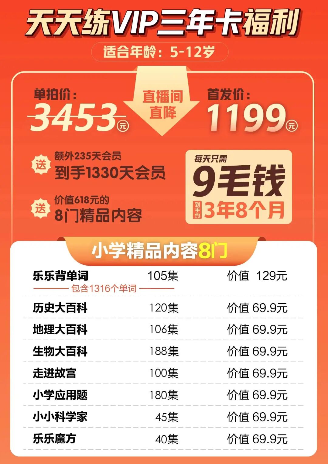 第二个消息,我们会在明天12月14日(周三)上午8:50的直播间,帮大家薅最后一波福利。遗憾的是,这次我们所有的价格政策和赠品福利都只能通过在直播下单才能享受,品牌方不允许在团文里直接放购买链接,所以妈妈们一定要记得定好闹钟,明天来直播间下单抢占名额,这种学习刚需必须囤上!第一,15号涨价前最后一波好价+赠品,每天9毛钱,省钱省妈!这次给大家准备的还是天天练小学/初中三年卡,只要1199元,额外加送235天,到手1330天会员有效期。非常适合小学生、初中生和幼小衔接的孩子,全学科提高。2000+的课程看起来很多,但平均下来每天只需要10分钟的时间,孩子课余时间、吃饭时间或者是睡觉前刷几集,就能牢牢掌握知识点。另外我们还会继续加赠618元的精品课,背单词、走进故宫、历史大百科等等,这些课平时都需要单独购买,现在直接送。这些单拍价值超过3000块的课程,这次直播间专享价只要1199元,一天只要9毛钱,可以同时登录2台设备,家里老大老二都能一块学,真的超级划算。家长只买孩子现在的学段就好,比如孩子在上六年级,买小学段就行,后续可以小学转初中,不会浪费,3年8个月的有效期,小学卡也能用到初中毕业。为了让大家放心下单,我还争取到了一个专场的独家福利,买完课3天之内,可以免费试用下单学段的所有课程,让孩子连上几节课体验一下,看看孩子的学习效果,不满意全额退款。因为是直播间专享活动,我在直播间还给大家准备了超级多福袋和抽奖活动,下单就可以抽买一送一的三年卡名额和精品课。12月14日(周三)上午8:50,我会在直播间继续给大家讲一讲学习干货/解答疑问,妈妈们想要详细了解天天练,或是不确定该选择哪个阶段的,直接预约直播间。建议大家一定要抓住这次机会,名额有限,还是涨价前最后一波,真的是先囤先省钱。聊到天天练该到底怎么学的时候,有一句话我印象特别深,王老师说学习分三步:第一步是要搞清楚什么是知识点(看懂课本看懂知识),第二步把知识转化为生产力,也就是学方法学技巧,最后才是做教辅刷题。孩子没有掌握好知识点,基础没打牢就去刷题效果不会好,而天天练就是先讲知识,再讲技巧,最后用真题来巩固知识点,学习的逻辑搞顺了,孩子才能学懂、学会。
