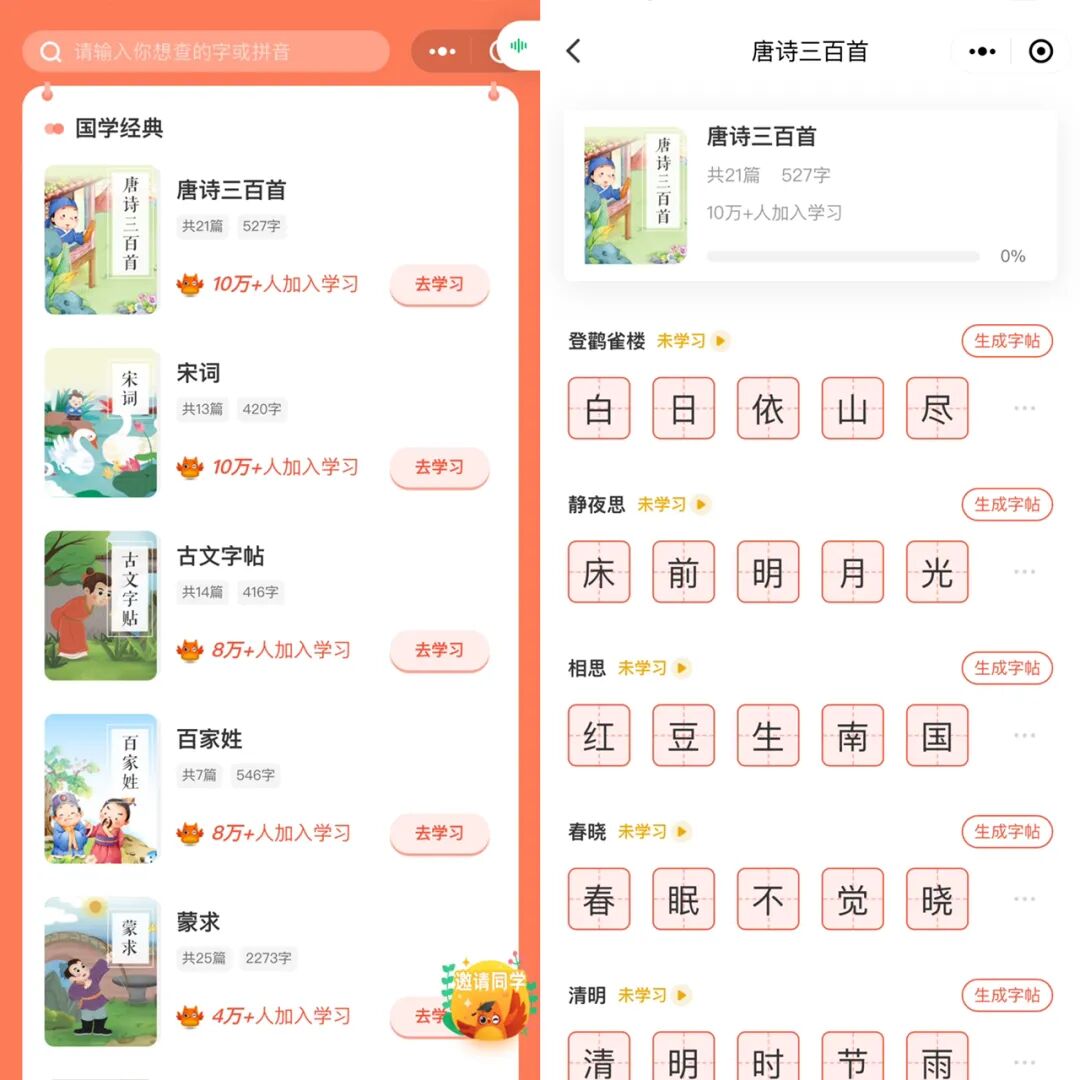 除了识字,还包括唐诗、宋词、千字文等国学经典的学习内容,同样都可以生成字帖,进行认字、练字、朗读。