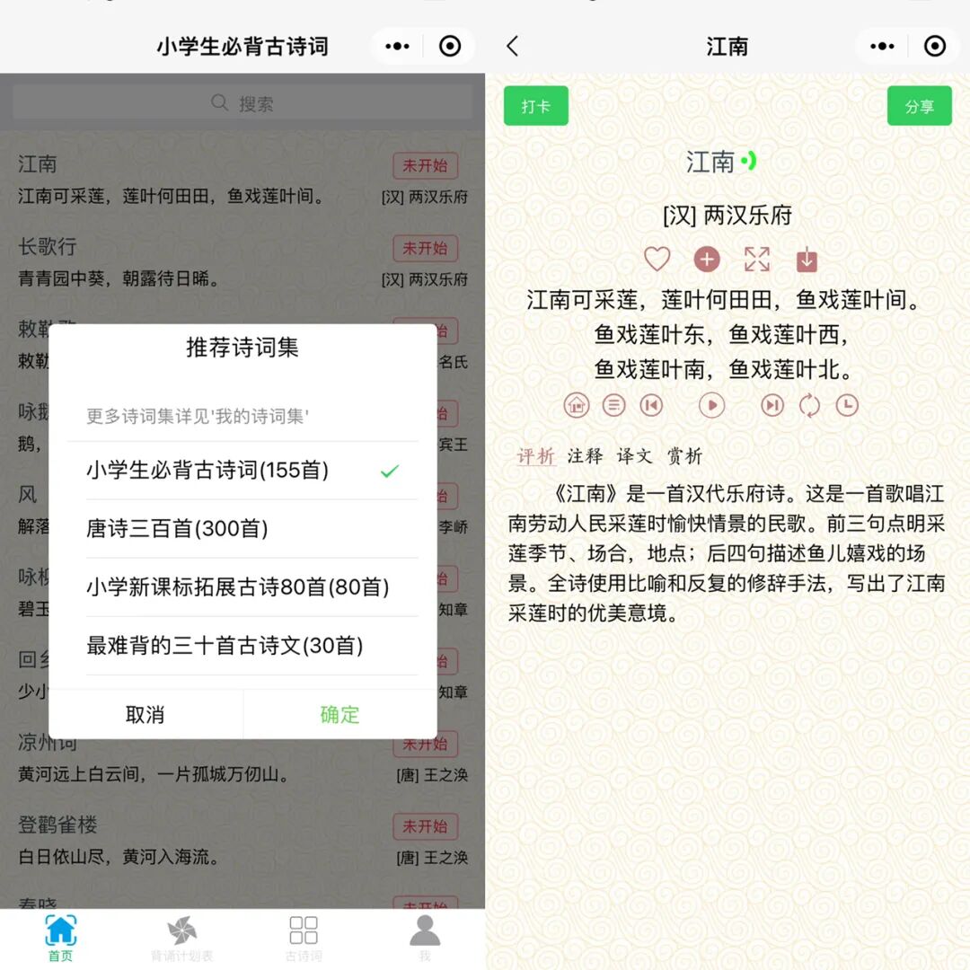 这是一个专门让小学生背古诗词的小程序,一进入小程序就让你选背诵计划,比如唐诗300首,还是小学生必背古诗155首,然后首页就会全部显示出来。