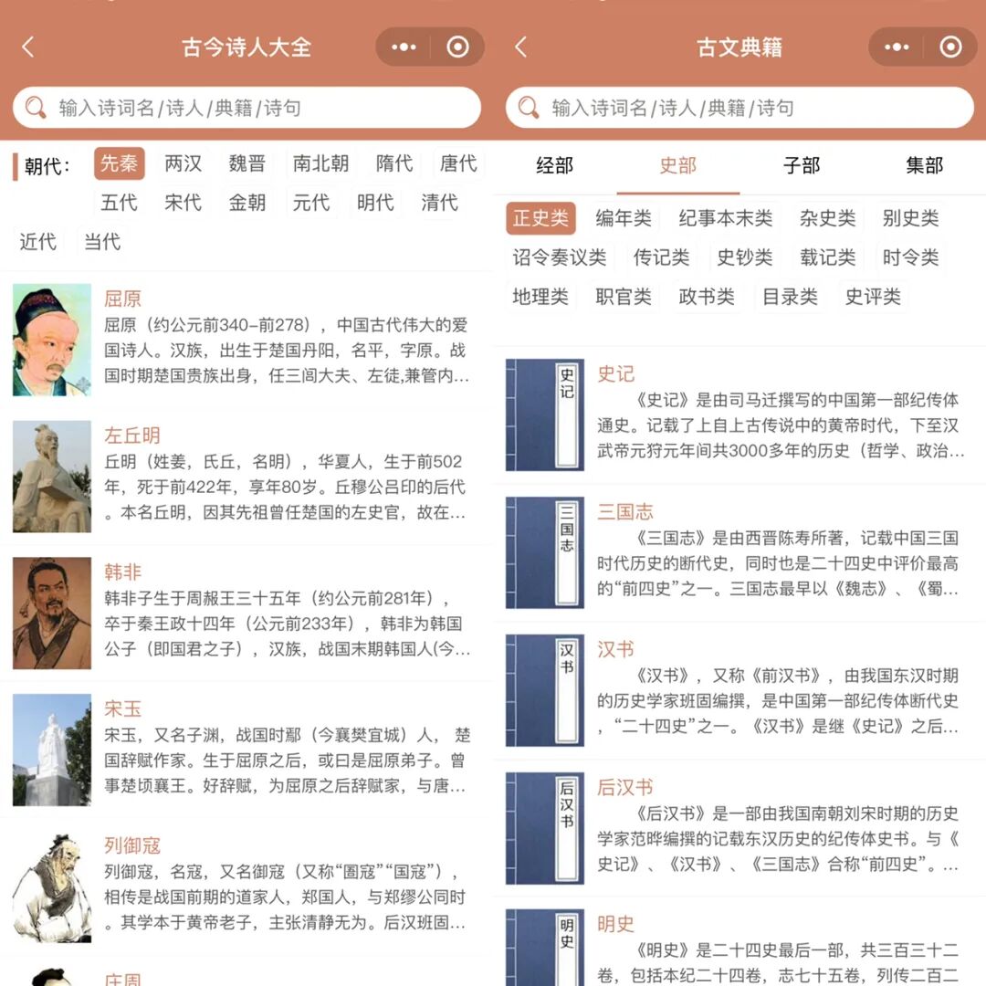 这个小程序是个宝藏资源库,古诗、文言文学习相关素材这里都有,包含了小学,初中,高中各个阶段。除了古诗之外,还有文言文、热门典籍,以及孩子们熟悉的各种诗人的生平和故事。