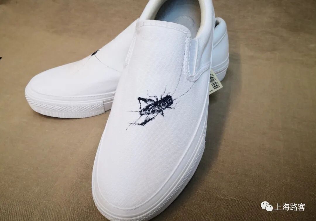 “疫情期间,许多时间不上班,过年以后,我儿子女儿都去了瑞典,我就一个人在上海,这里很安静,外面也不能出去,我就把马、狼、蜥蜴之类,画在衣服上、鞋子上。往年我都喜欢去外地采采风,今年就一直在这里画这些东西,结果要的人很多,于是我有空就画,就这样画到现在。