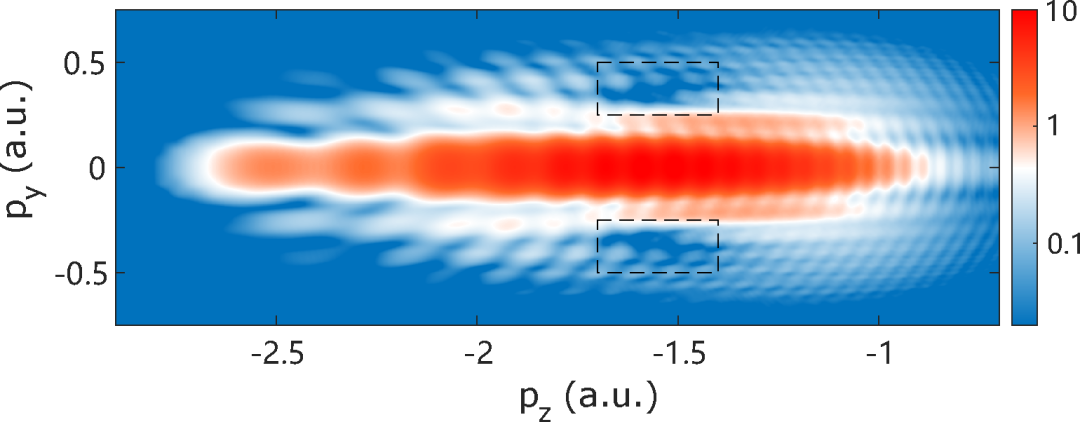 在更短的极紫外激光脉冲中,由于激光包络的快速变化而引起原子电子态的非绝热跃迁过程十分显著。此时红外激光诱导的隧穿电离不仅仅来自于原子的基态,由于非绝热跃迁过程产生电子态对隧穿电离也有贡献。从而,导致光电子的全息干涉谱中出现叉状结构(如图3黑色虚线框所示)。通过分析叉状结构分布的位置,可以获得超强极紫外激光中的非绝热演化过程的信息。